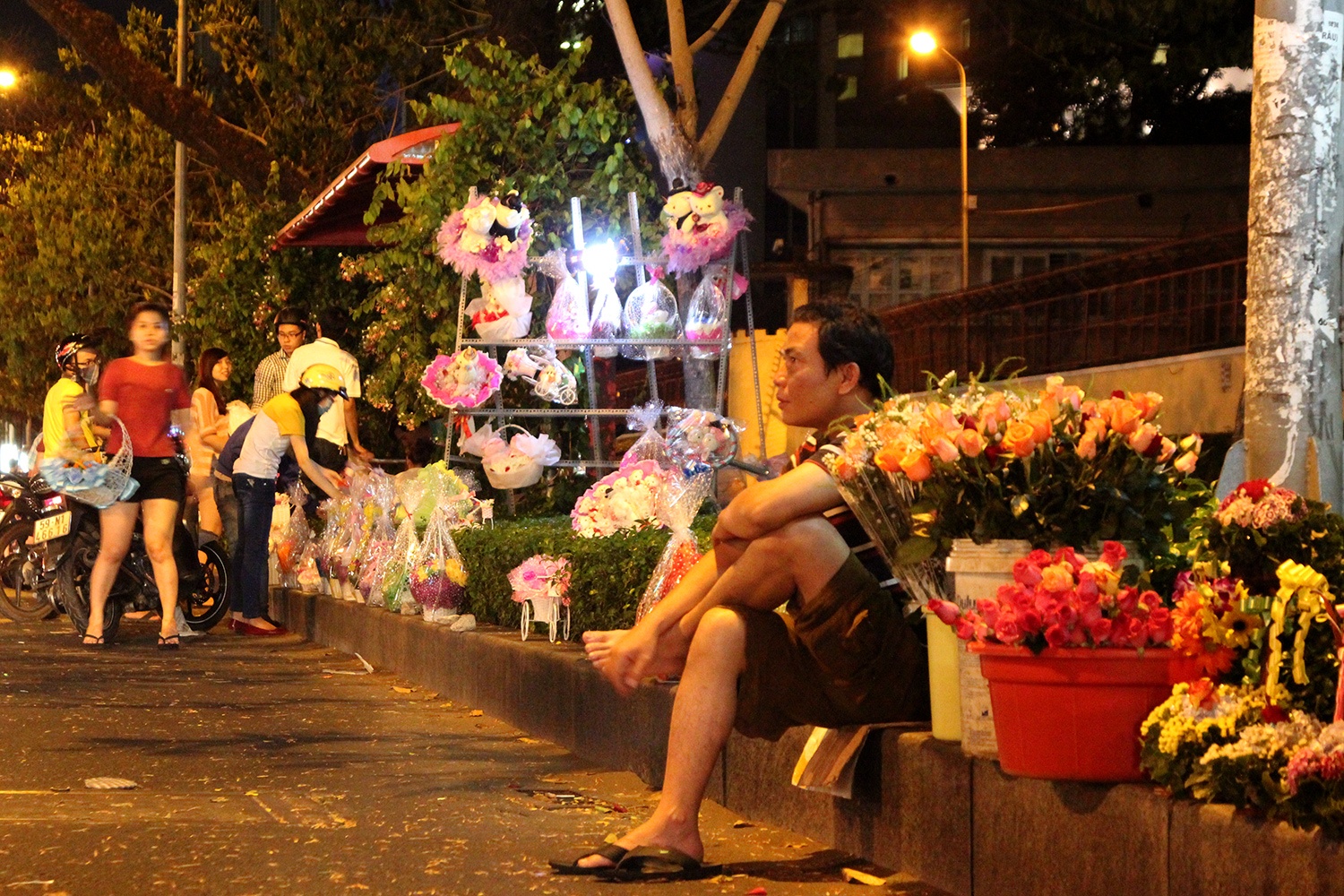 | Hoa tươi vắng khách, trong khi đó sạp bán hoa gấu thu hút đông người mua từ tối 7/3. Ảnh: Zen Nguyễn. |