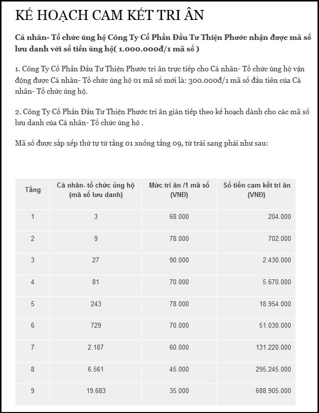 | Bảng chia lợi nhuận cho những thành viên tham gia đóng phí từ thiện và ăn lãi kiểu đa cấp. Ảnh chụp lại màn hình. |