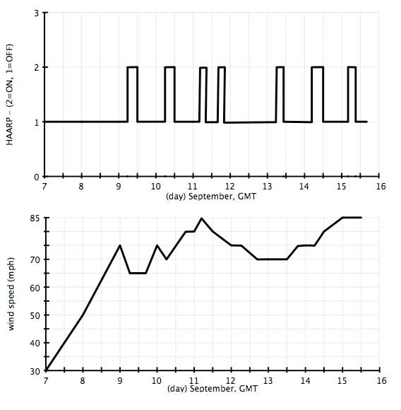 | Những thay đổi được các nhà khoa học ghi nhận lại khi HAARP hoạt động (ở phía trên) và tốc độ gió của bão Ophelia (ở dưới). Ảnh: Apollo. |