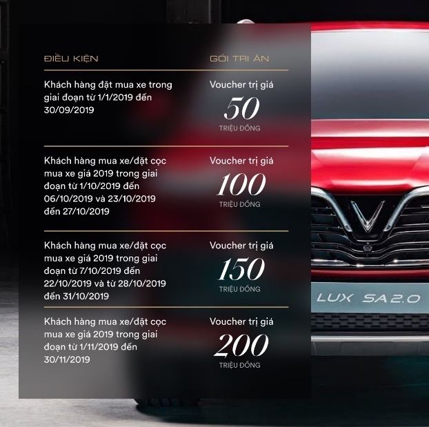 Bên cạnh đó, nếu lựa chọn phương án thanh toán 100% và không vay ngân hàng, khách hàng mua xe VinFast Lux sẽ được tặng một voucher với tổng giá trị bằng 13% giá xe. Voucher có thể sử dụng để thanh toán mua nhà Vinhomes, mua xe VinFast cho bản thân hoặc vợ/chồng/con ruột. Voucher cũng có thể quy đổi thành điểm VinID với giá trị tương đương để sử dụng các dịch vụ khác của Vingroup. Hạn sử dụng voucher là 6 tháng kể từ ngày phát hành cho khách hàng.