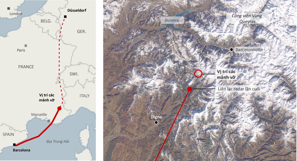 | Vị trí máy bay của Germanwings gặp nạn trên dãy Alps. Đồ họa: New York Times |