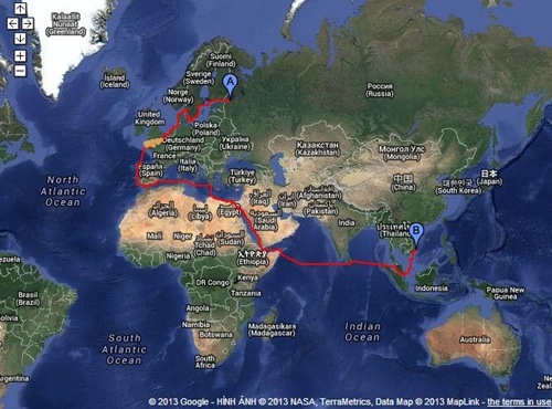 | Tuyến đường biển ngắn nhất để tàu Kilo Hà Nội về Việt Nam qua ngả châu Phi, theo tính toán của trang Ports.com. |