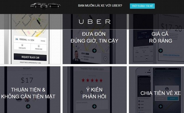 | Trang chủ của Uber hiển thị tiếng Việt nhằm thu hút 'đối tác' và người đi xe, dù bản thân Uber chưa hiện diện tại Việt Nam theo đúng quy định. Lối kinh doanh thiếu tôn trọng quốc gia sở tại khiến Uber vấp phải làn sóng 'tẩy chay'. |