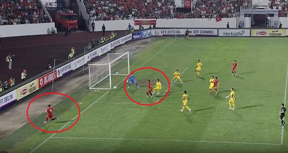 Ở tình huống này, Đỗ Hoàng Hên kéo bóng xuống sát đường biên ngang trước khi thực hiện đường căng ngang vào trong. Khoảnh khắc cho thấy bóng ở vị trí gần khung thành hơn so với Xuân Son theo hướng tấn công của tuyển Việt Nam.