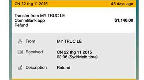 Lệnh chuyển tiền trả lại cho khách hàng của Vi Tran có tên My Truc Le. Ảnh do một nạn nhân của Vi Tran, hiện đang ở Việt Nam cung cấp. |