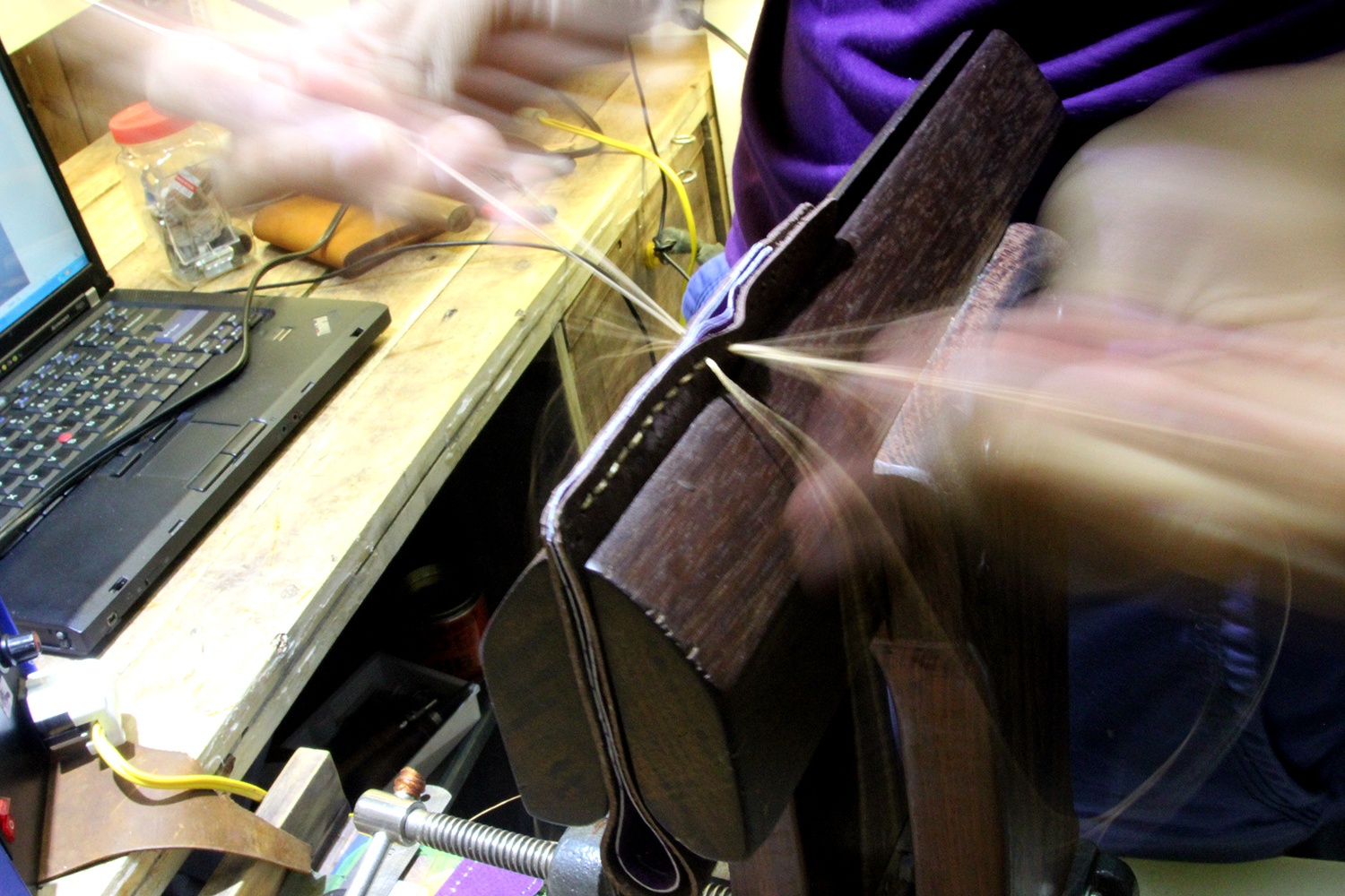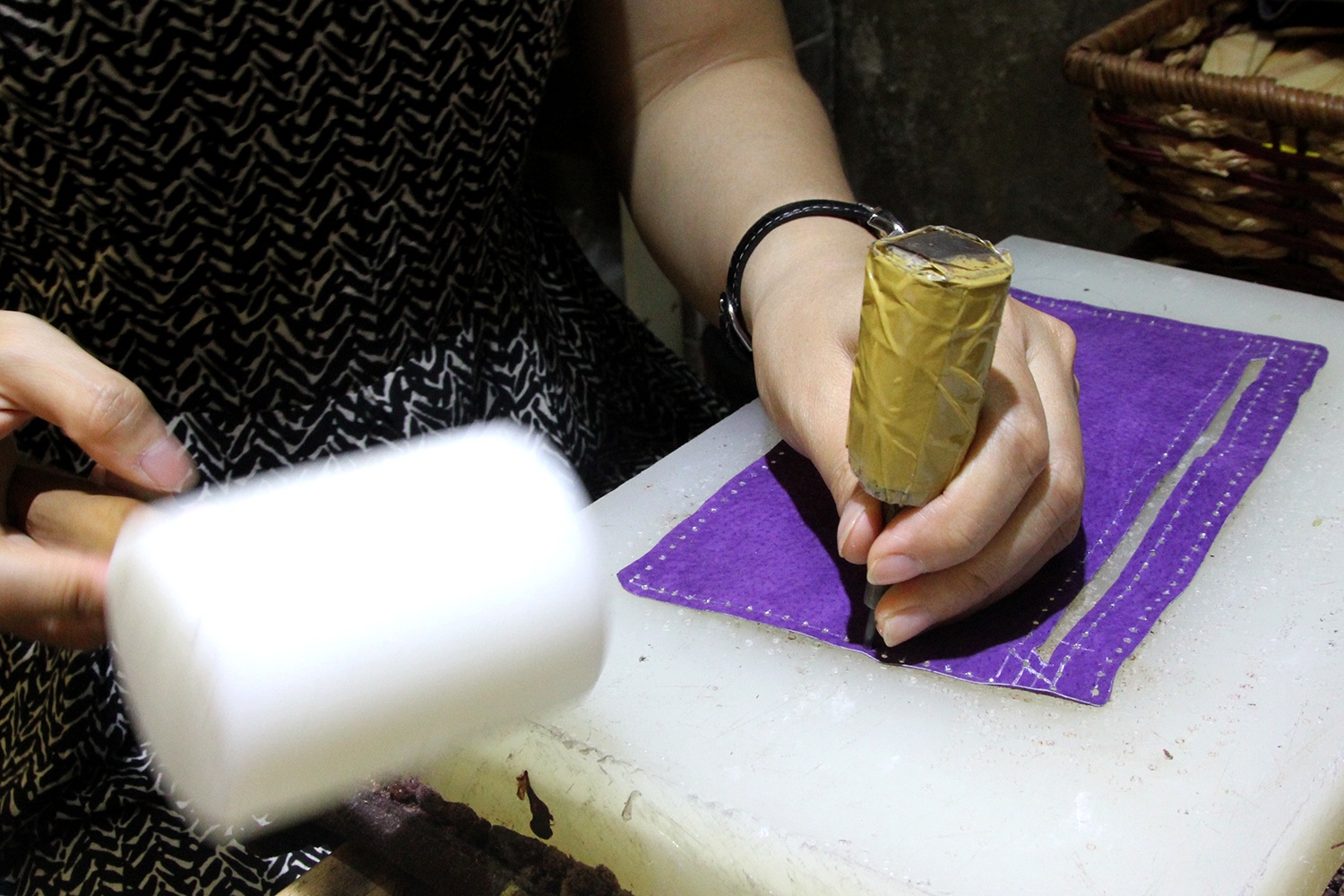 | Tất cả các công đoạn đều được làm thủ công, kể cả việc đục lỗ để ghép các miếng da lại với nhau. |