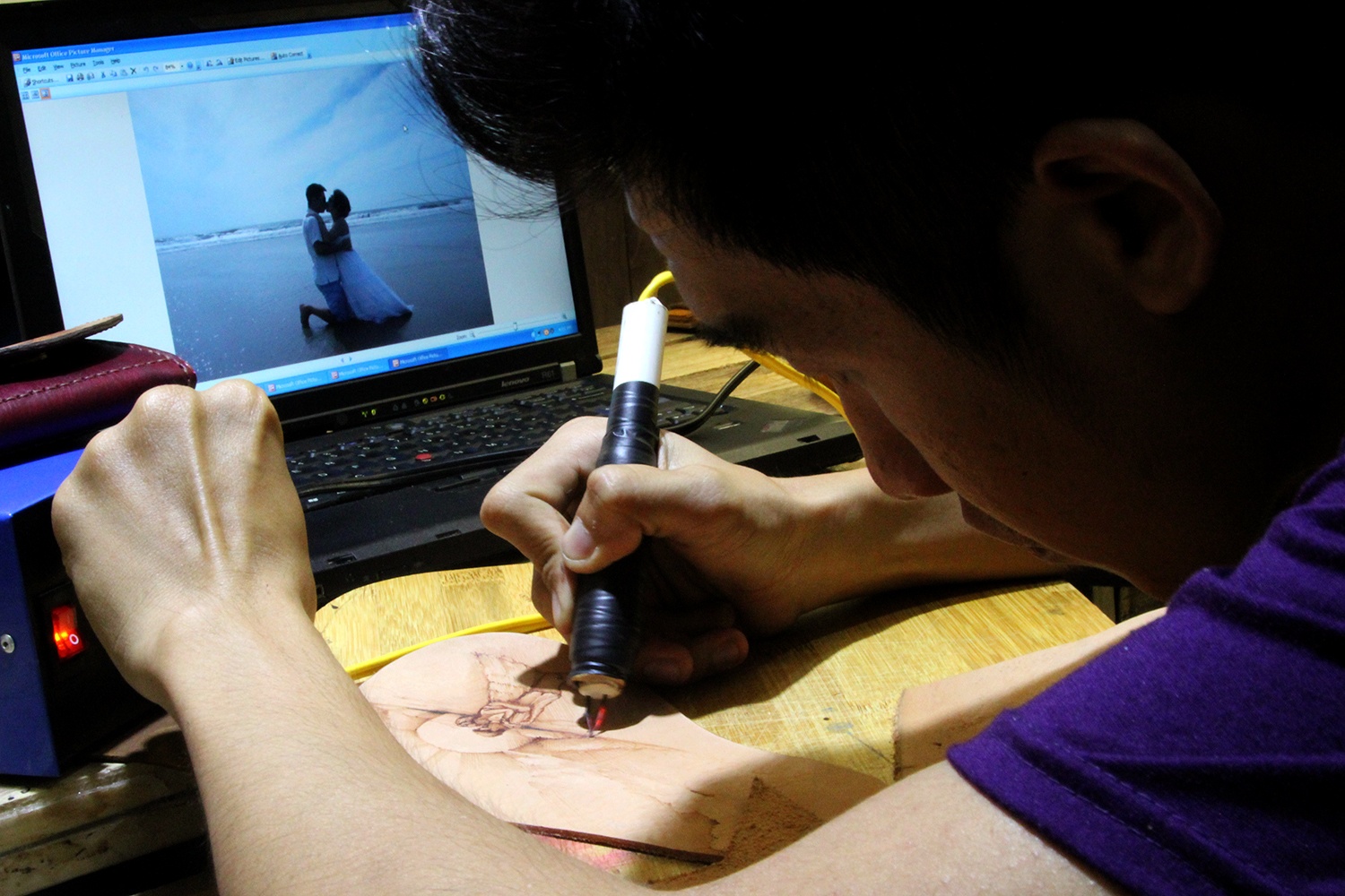 Chị Thảo, chủ cửa hàng cho biết, xuất phát từ sự đam mê đồ da, muốn tạo ra những sản phẩm độc quyền dành riêng cho từng người, từ lâu chị đã nghiên cứu cách vẽ chân dung lên bề mặt da. Sau thời gian mày mò thử nghiệm, chị đã thiết kế và vẽ thành công chân dung, hình ảnh lên mặt da theo yêu cầu của khách.