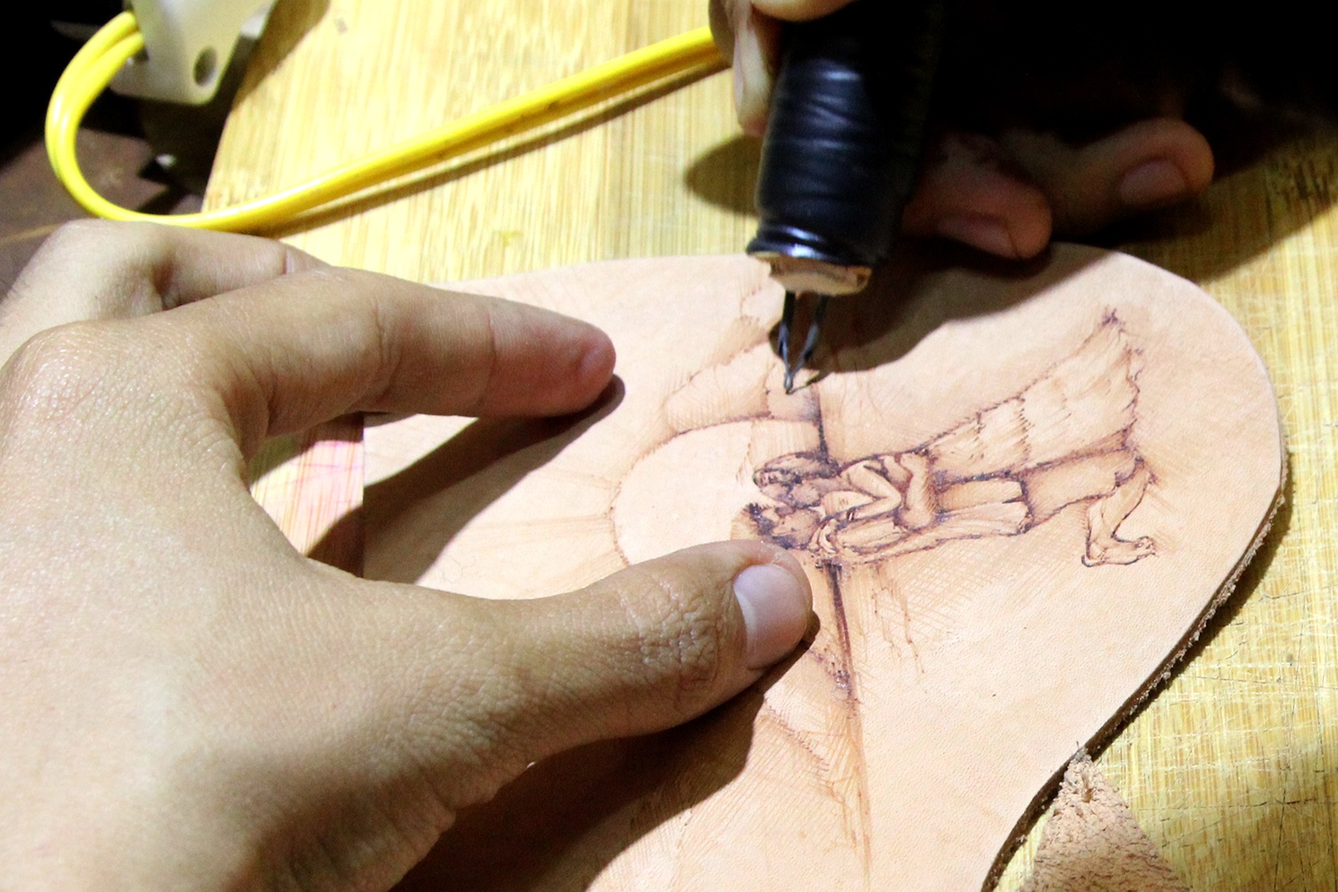 Để vẽ hình lên ví theo yêu cầu, người thợ sẽ dùng bút nhiệt.