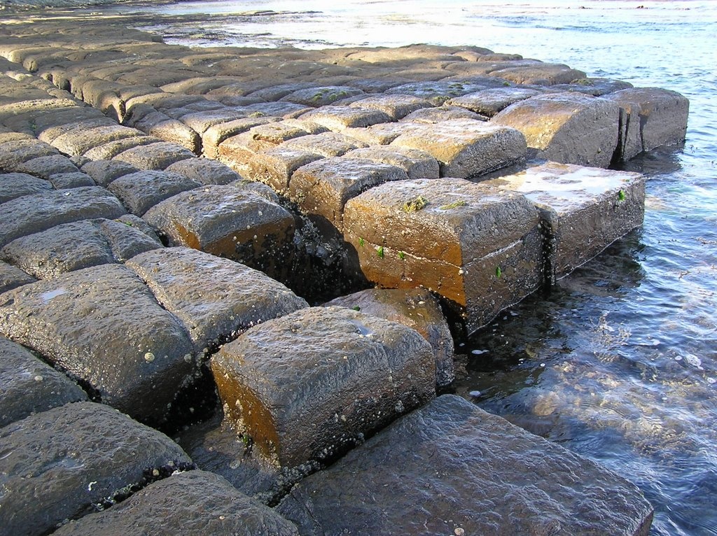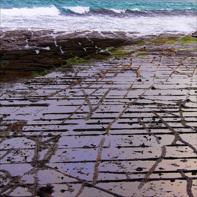 | Độ bằng phẳng của mặt đá này khiến người ta nghĩ do những con sóng mang theo cát, sỏi đến xói mòn hay bởi phản ứng hóa học của nước biển. |