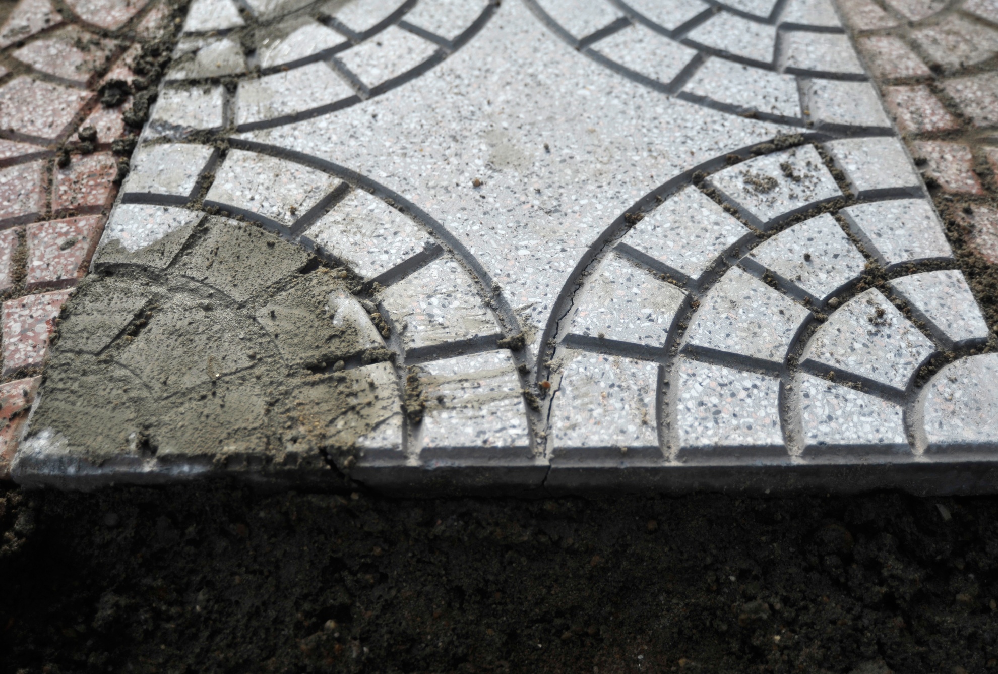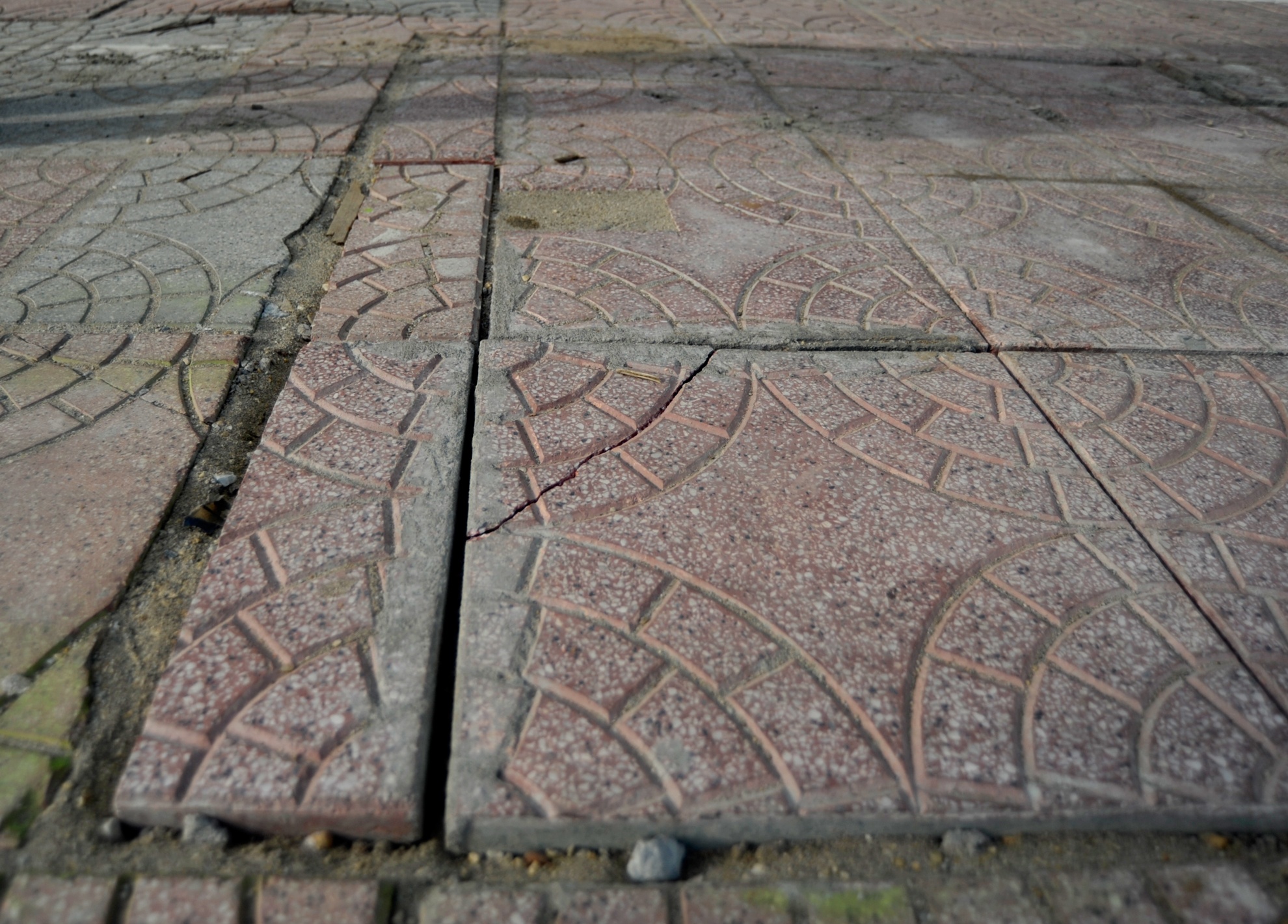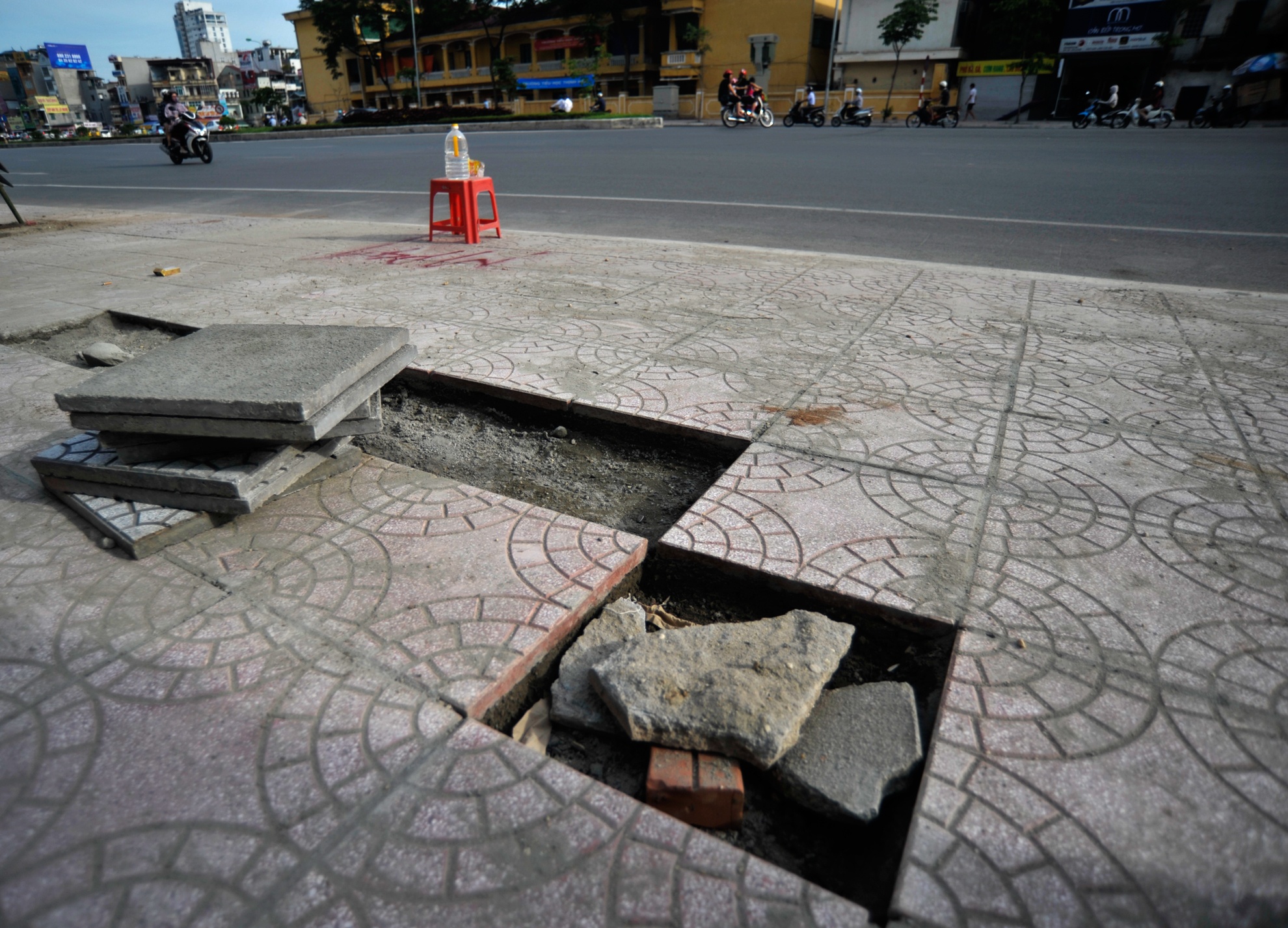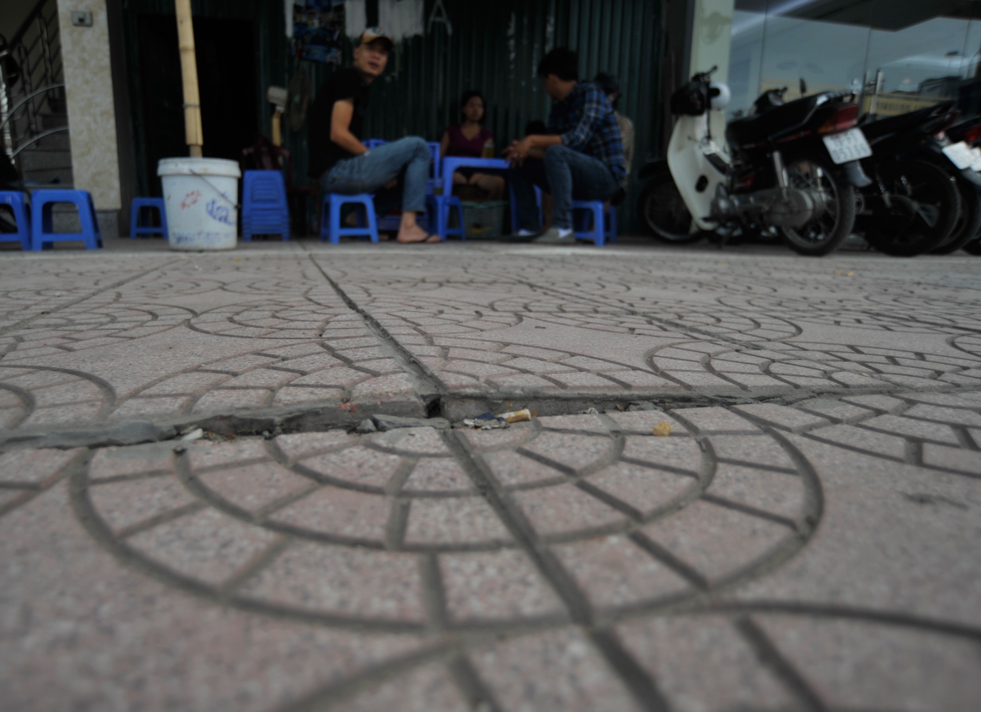 | Gạch lát trên vỉa hè nứt vỡ và sớm được chắp vá. |