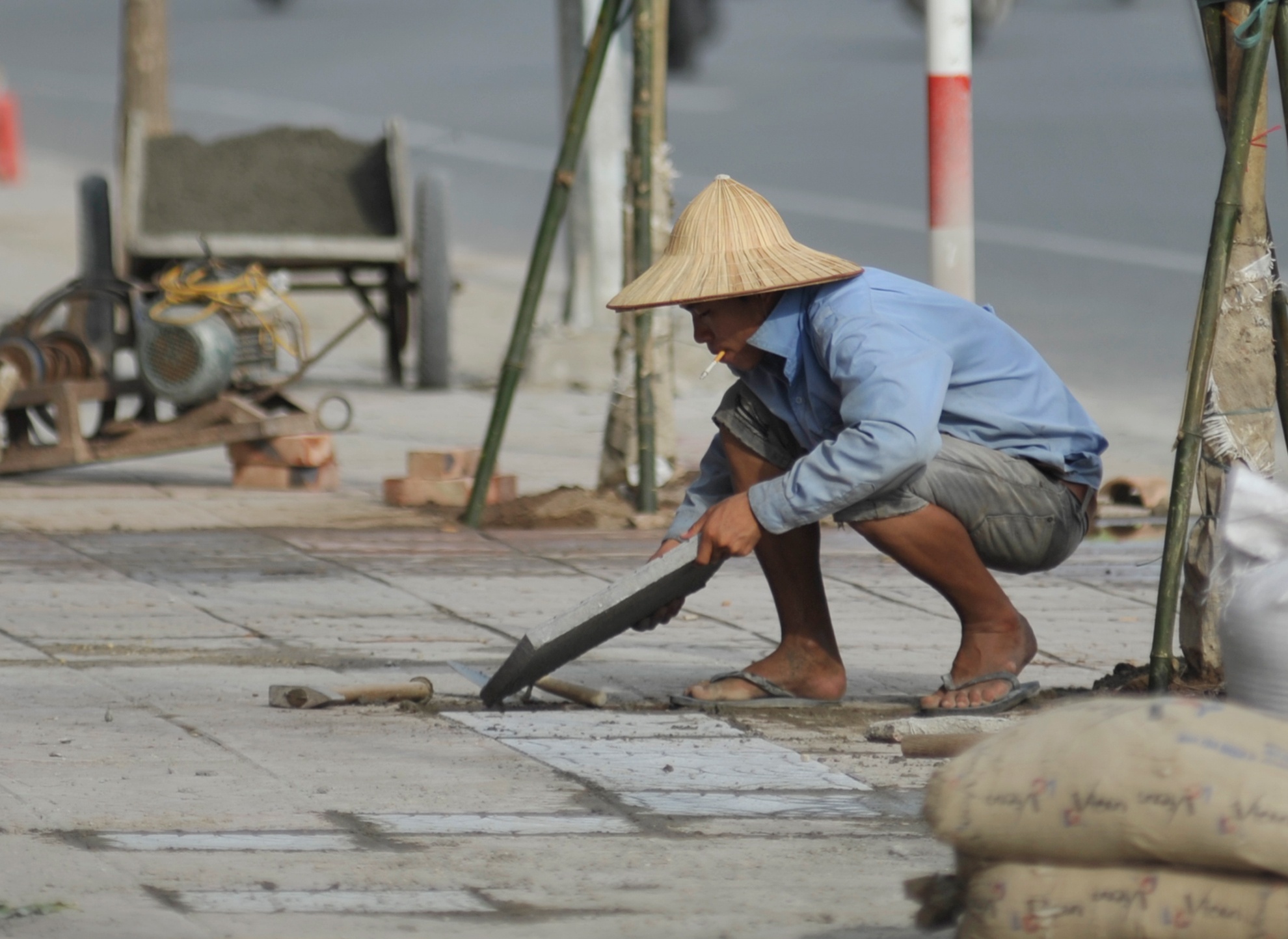 | Giữa tuyến, một mảng gạch được bỏ dở trong quá trình thợ đang lát lại |