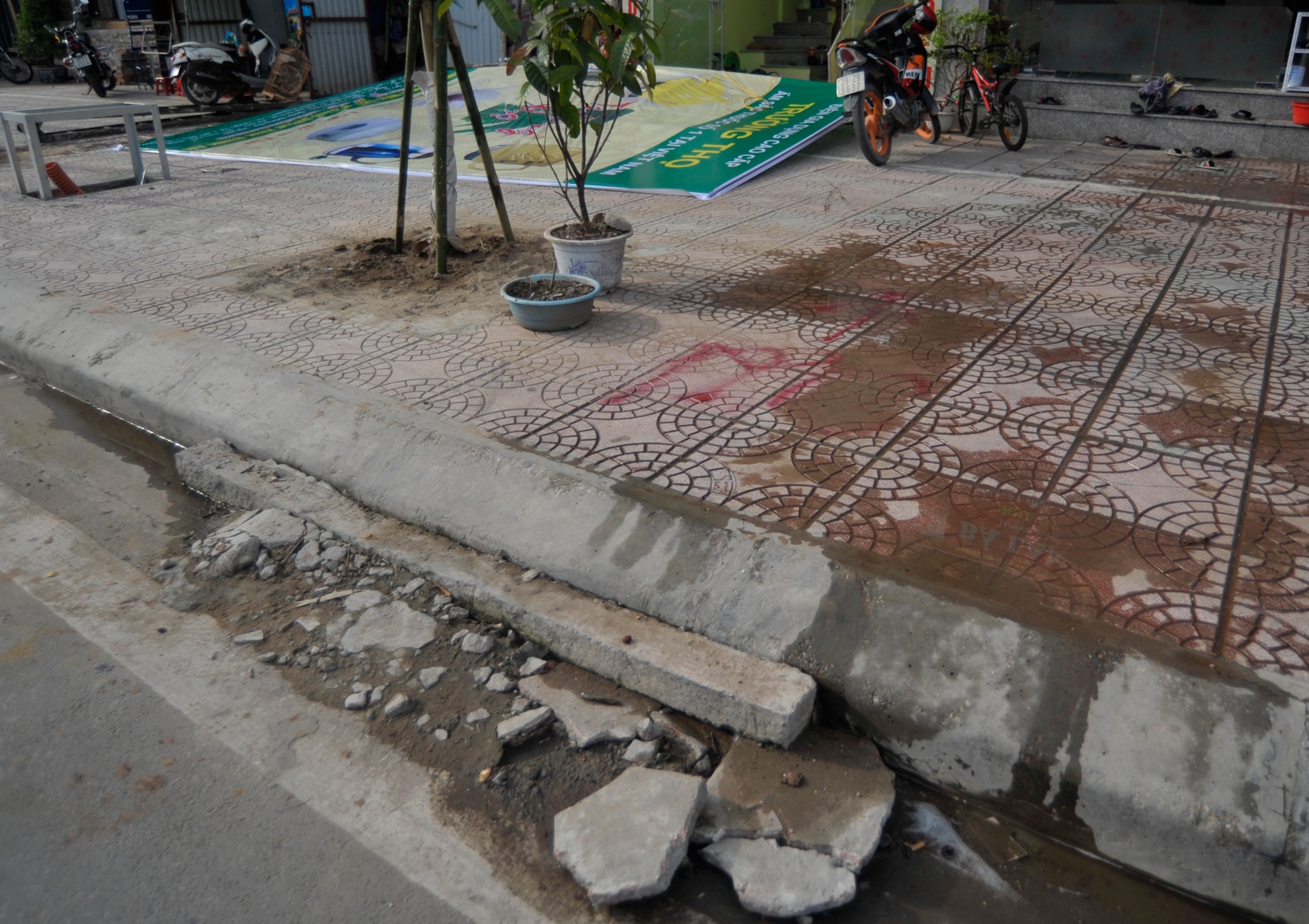 | Độ chênh lệch giữa vỉa hè và lòng đường khá cao. Để thuận tiện người dân phải đôn thêm gạch đá để tiện cho xe di chuyển qua lại, nhưng lại gây khó khăn cho việc thoát nước trên tuyến đường. |