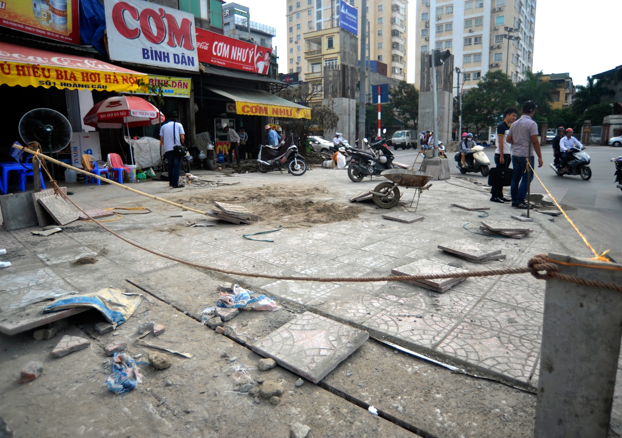 | Phía tay trái đường hướng Ô Chợ Dừa về Hoàn Cầu, đoạn giao với Hoàn Cầu vỉa hè đang được bóc lên và lát lại gạch mới. |