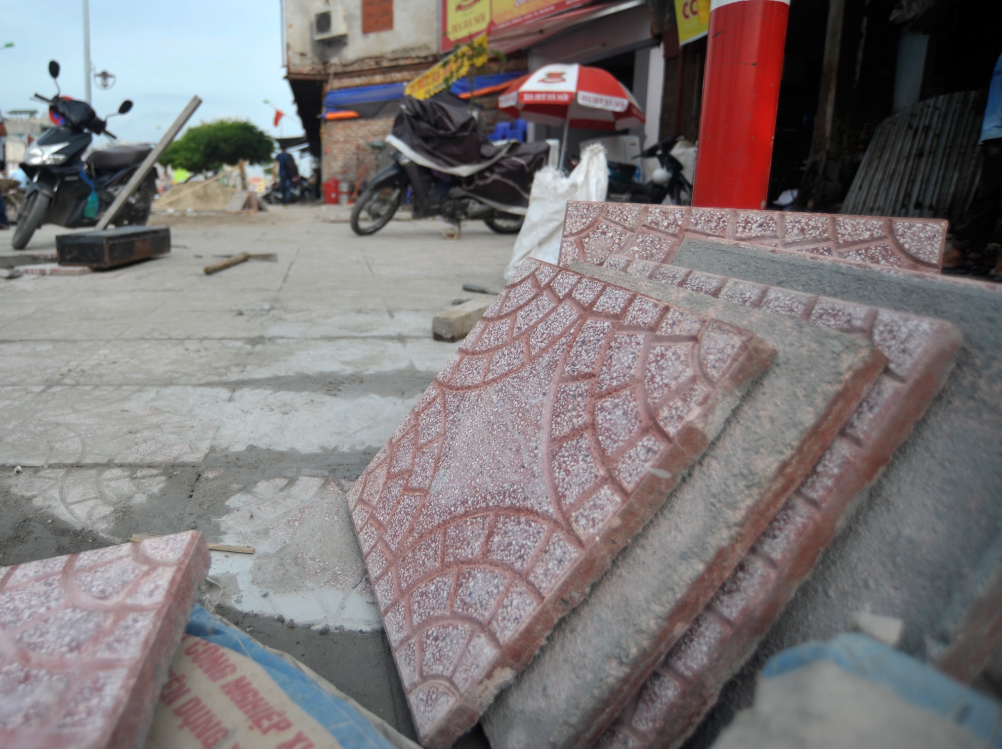 | Người dân ở đây cho biết, những viên gạch này khá dễ vỡ và 2 tuần nay có một vài công nhân đang bóc những viên gạch bị vỡ ra để thay thế. |