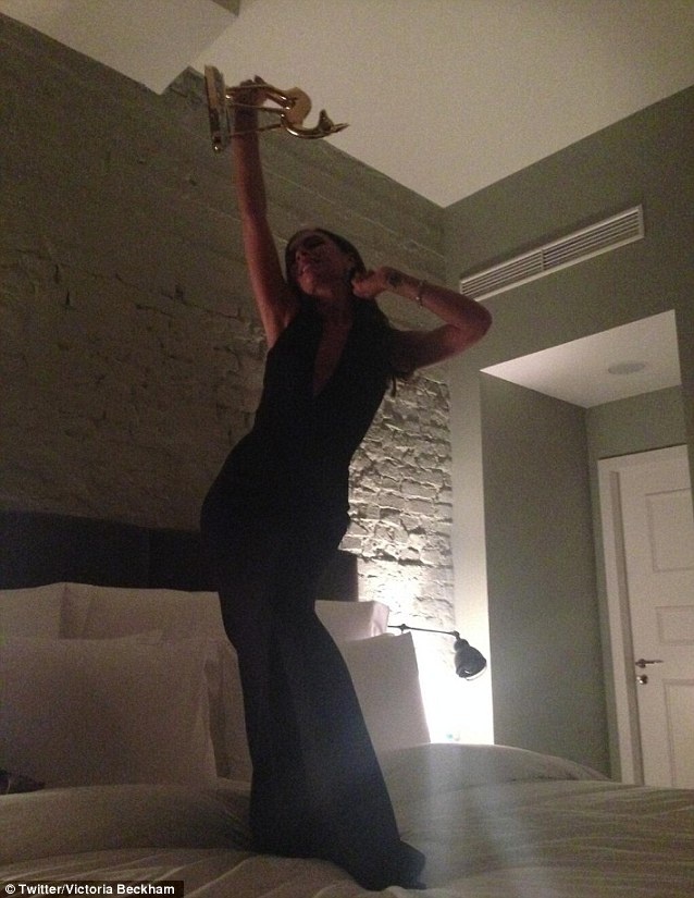 Nghịch ngợm tạo dáng với cúp vàng trên giường khách sạn. Thật không thể ngờ bà Becks cũng có những khoảnh khắc xuất thần như thế này.