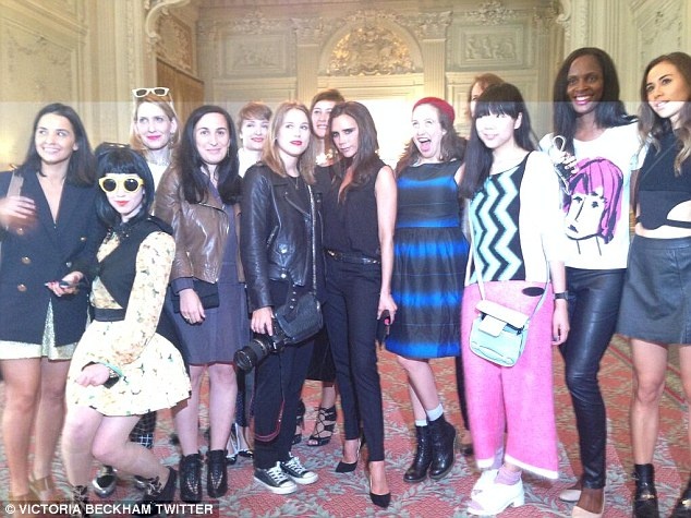 | Victoria chụp ảnh lưu niệm với mọi người tại cuộc họp báo thời trang diễn ra ở đại sứ quán. |