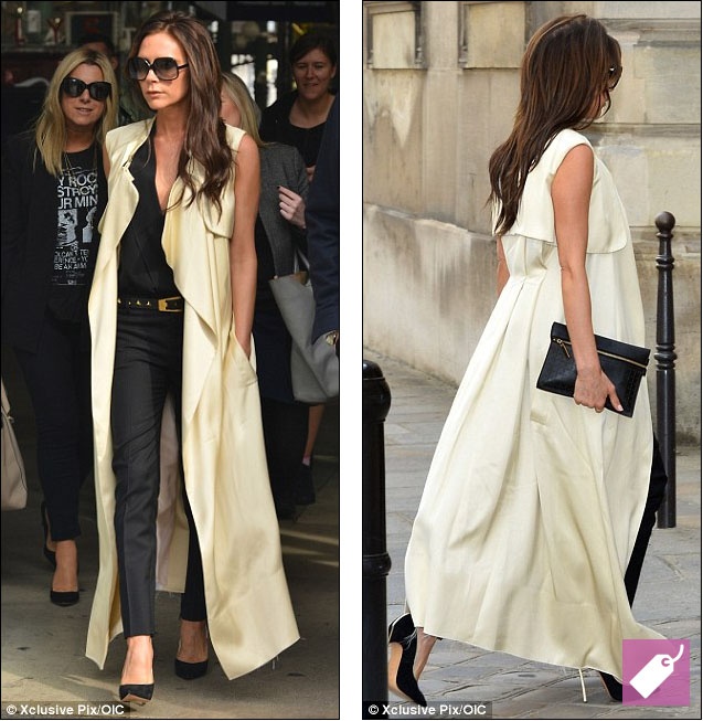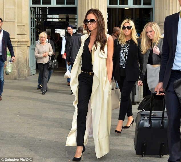 | Victoria Beckham sang trọng trong chiếc áo khoác dài lộ tay màu vàng nhạt xuất hiện tại sân ga Du Nord – Paris. |