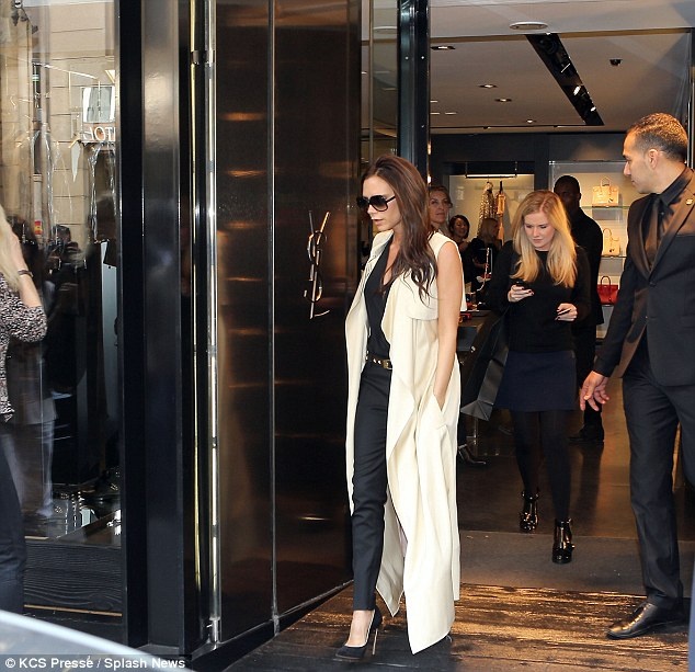 Kể từ lần ra mắt bộ sưu tập thời trang đầu tiên của mình vào tháng 9/2008, Victoria đã nhận được rất nhiều lời khen từ giới phê bình và cho đến bây giờ cái tên Victoria Beckham đã trở thành một thương hiệu thời trang lớn trên thế giới. Victoria bước vào cửa hiệu Yves Saint Laurent sau khi ăn trưa cùng khách hàng. |