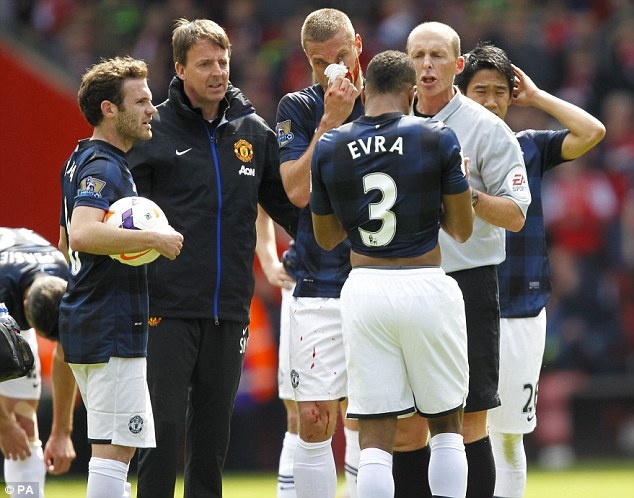 | Cầu thủ M.U quây kín trọng tài khiếu nại sau pha va chạm khiến Vidic đầm đìa máu. |