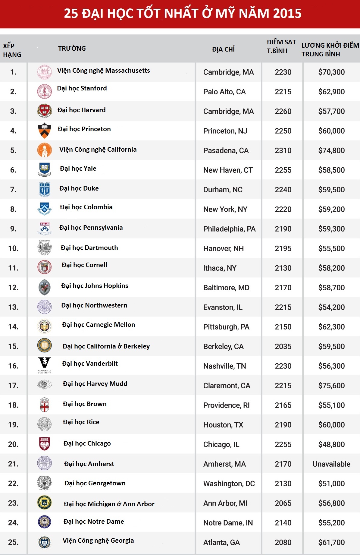 | Bảng xếp hạng 25 đại học tốt nhất ở Mỹ năm 2015. Ảnh: Business Insider |