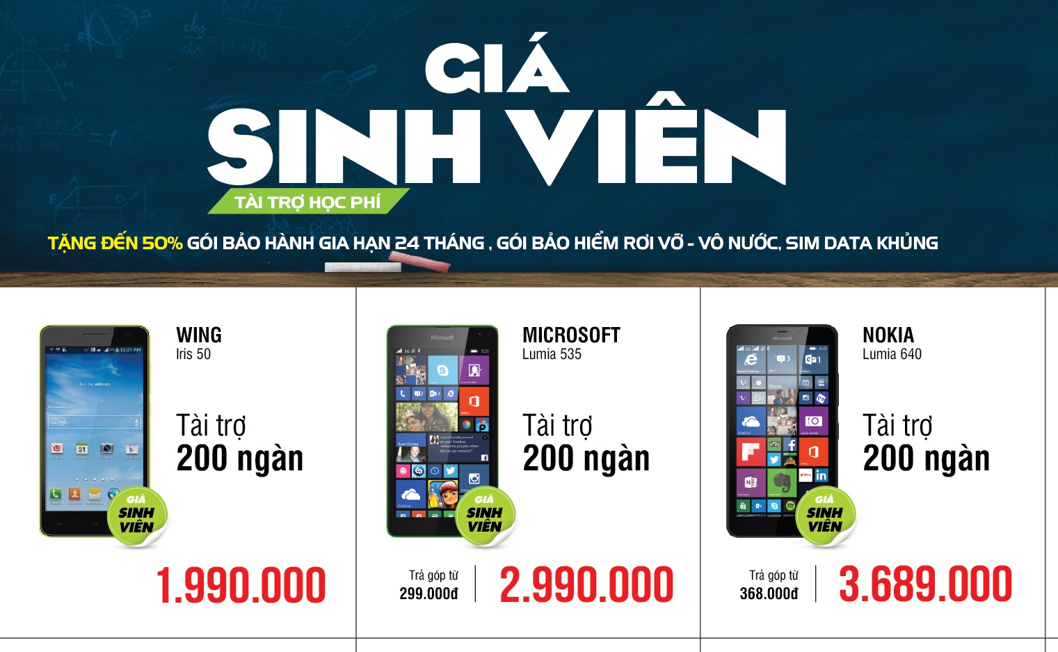 Đặc biệt, học sinh, sinh viên khi mang theo thẻ sinh viên, CMND hoặc giấy báo nhập học sẽ được mua sản phẩm (trong danh sách khuyến mãi) với mức giá sốc chưa từng có. Đồng thời, Viễn Thông A còn tặng đến 50% gói Gia hạn bảo hành 24 tháng, gói Bảo hiểm rơi vỡ - vô nước, sim data khủng. Riêng các bạn tân sinh viên mùa thi năm nay chỉ cần mang theo phiếu báo điểm còn có cơ hội nhận học bổng Viễn Thông A trị giá 60 triệu đồng.