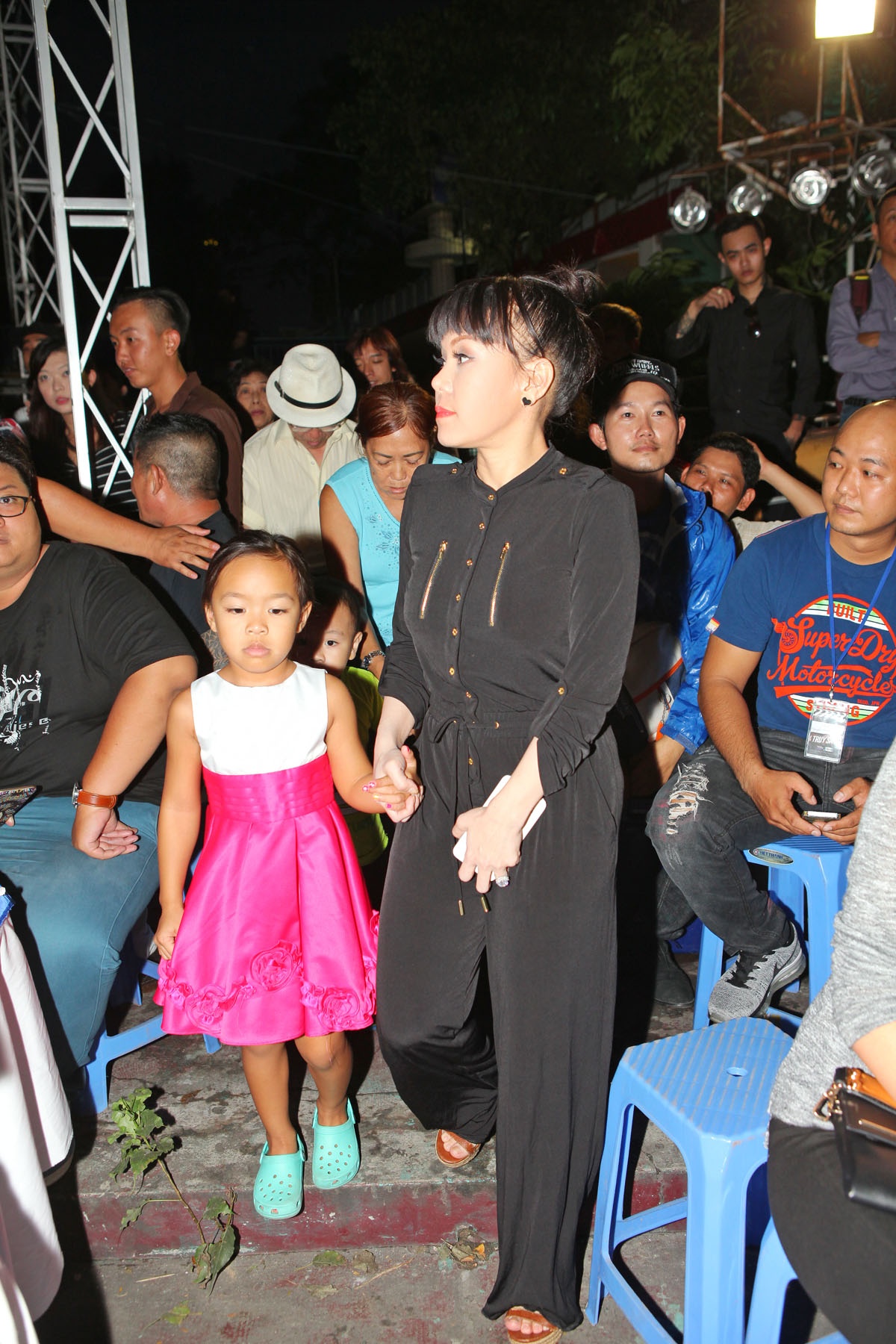 Sân khấu chật kín vì người dân muốn thấy mặt nghệ sĩ khiến các bảo vệ chật vật. Việt Hương chen lấn trong đám đông để đưa người nhà vào trong. |