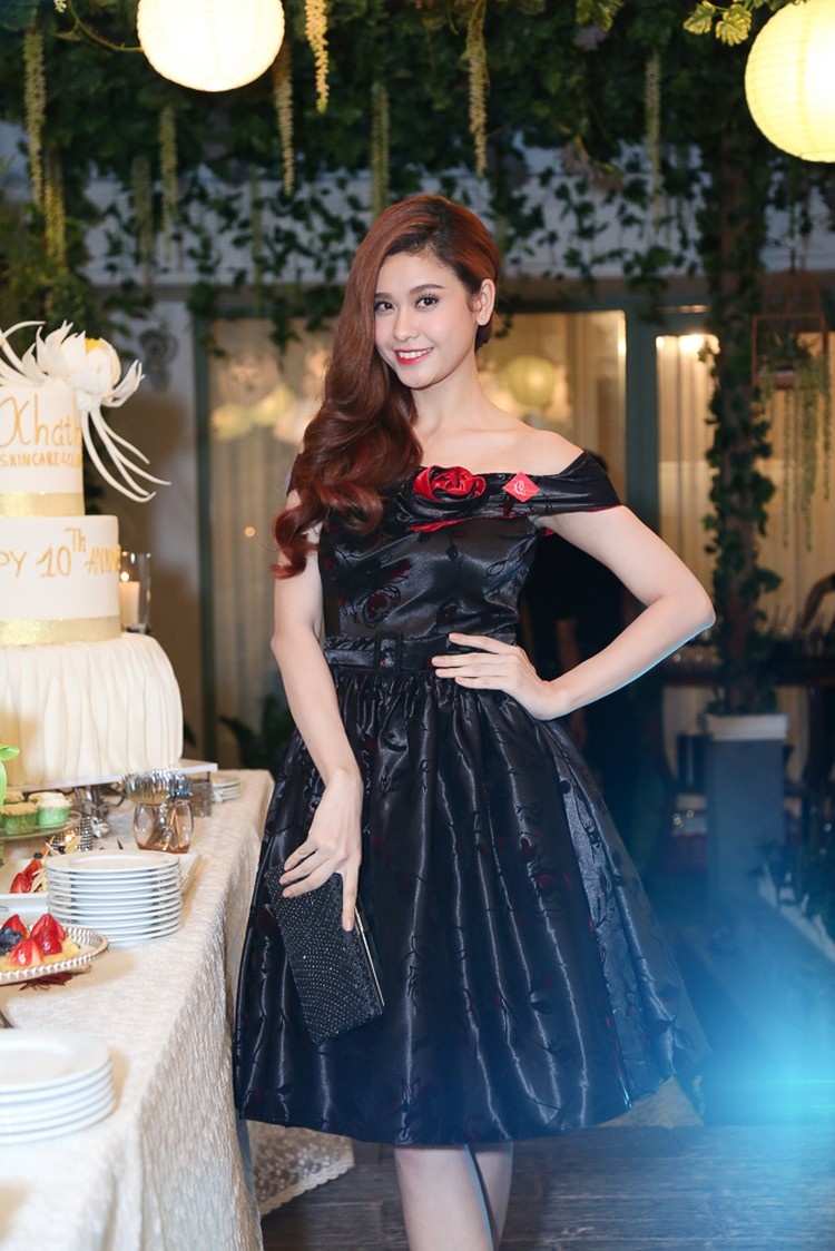 | Trương Quỳnh Anh điệu đà với váy tông đen in họa tiết chìm nổi bật ở buổi tiệc. |