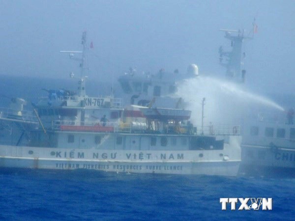 | Tàu Trung Quốc vây hãm và phun nước vào tàu kiểm ngư Việt Nam. Ảnh: TTXVN. |