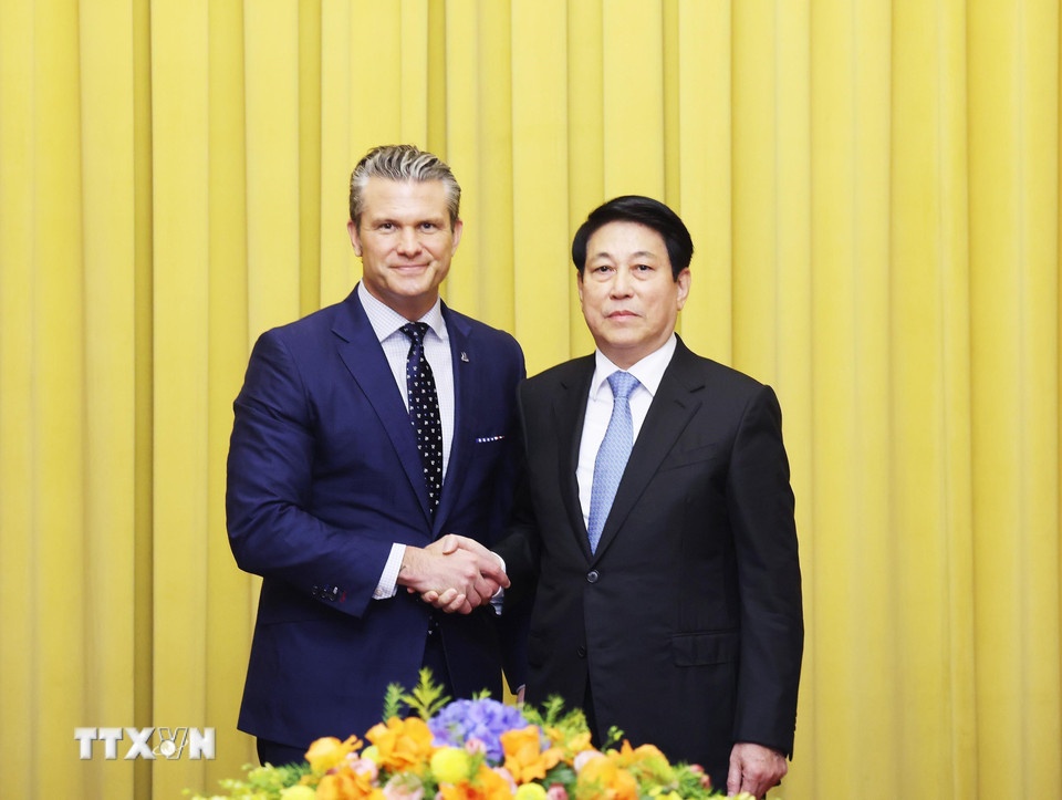 | Chủ tịch nước Lương Cường tiếp Bộ trưởng Bộ Chiến tranh Hoa Kỳ Pete Hegseth. Ảnh: Lâm Khánh/TTXVN. |