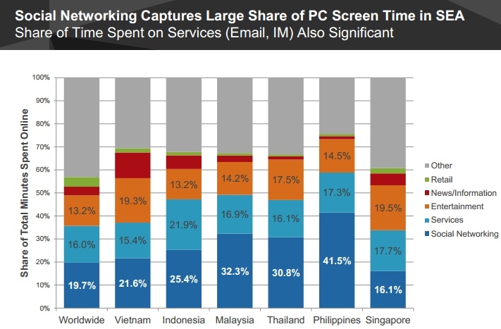 Thống kê của ComScore cũng cho thấy, người Việt Nam thích thú với các hình ảnh trên Internet, thích mua sắm trực tuyến và tốn thời gian đọc tin tức giải trí hơn các nước khác ở Đông Nam Á. Nhưng người Việt lại ít có nhu cầu đọc thông du lịch qua Internet.