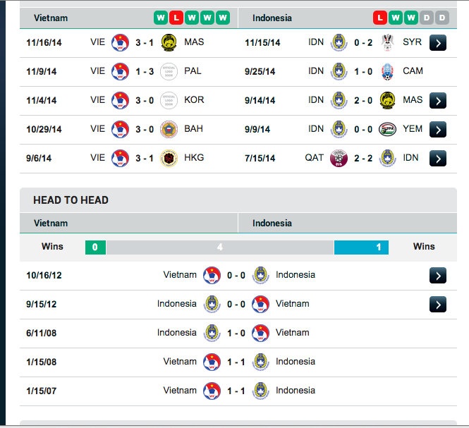 Ở lần gặp nhau gần đây nhất vào tháng 9/2012, hai đội đã hòa nhau 0-0. Tuy nhiên, cả Indonesia lẫn ĐTVN đều không mong muốn kết quả này lặp lại. Họ sẽ vào trận với quyết tâm cao nhất để giành trọn 3 điểm. Với 3 chân sút rất giàu kinh nghiệm là Sergio van Dijk, Cristian Gonzales và Boaz Salossa, Alfred Riedl rất lạc quan sẽ lấy điểm từ ĐTVN.