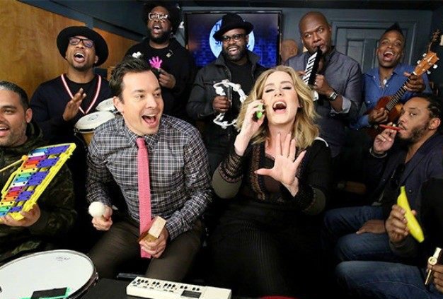 | Jimmy Fallon (Host của The Tonight Show with Jimmy Fallon) với clip quay Adele hát bản Hello. Ảnh: NBC. |