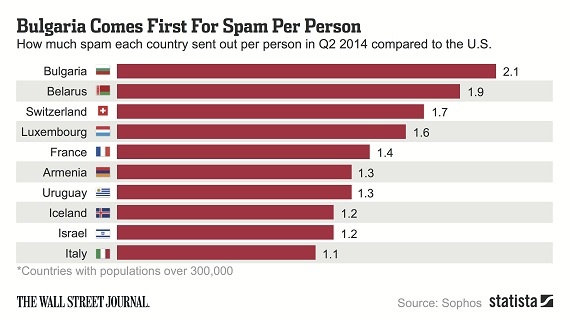 Vị trí dẫn đầu của Mỹ có thể là do dân số lớn, tỷ lệ người dùng công nghệ cao cũng như vai trò trung tâm thế giới số của quốc gia này. Khi xét tới tỷ lệ spam trên dân số, nước Mỹ tụt ra khỏi top 10. Đứng đầu danh sách số lượng spam/dân số là Bulgaria và Belarus, trung bình, trong quý vừa qua một người dân tại 2 quốc gia này sẽ gửi đi 2 tin rác.