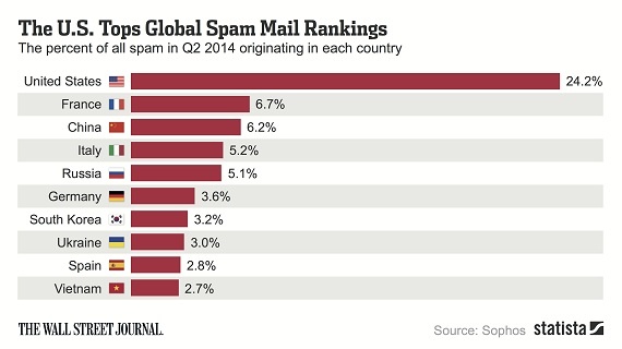 Dựa theo số liệu từ công ty bảo mật Sophos do Statista thống kê, nước Mỹ đóng góp nhiều nhất vào lượng thư rác khổng lồ trên thế giới: cứ 4 email spam gửi đi thì lại có 1 email đến từ nước Mỹ. Pháp và Trung Quốc nắm vị trí thứ 2 và 3: có 6,7% thư rác toàn cầu đến từ nước Pháp và 6,2% lượng email spam được gửi từ Trung Quốc.