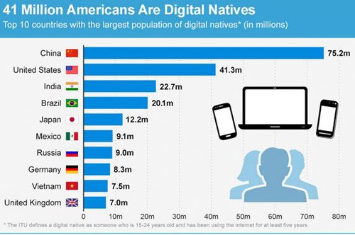 Theo bảng thống kê 10 nước có nhiều công dân sử dụng công nghệ số thành thạo nhất của ITU, Trung Quốc đứng thứ nhất với 75,2 triệu người; Mỹ đứng thứ 2 với 41,3 triệu người. Theo sau là các nước Ấn Độ, Brazil, Nhật, Mexico, Nga, Đức và Việt Nam đứng thứ 9 với 7,5 triệu người, Anh đứng thứ 10 với 7 triệu người.
