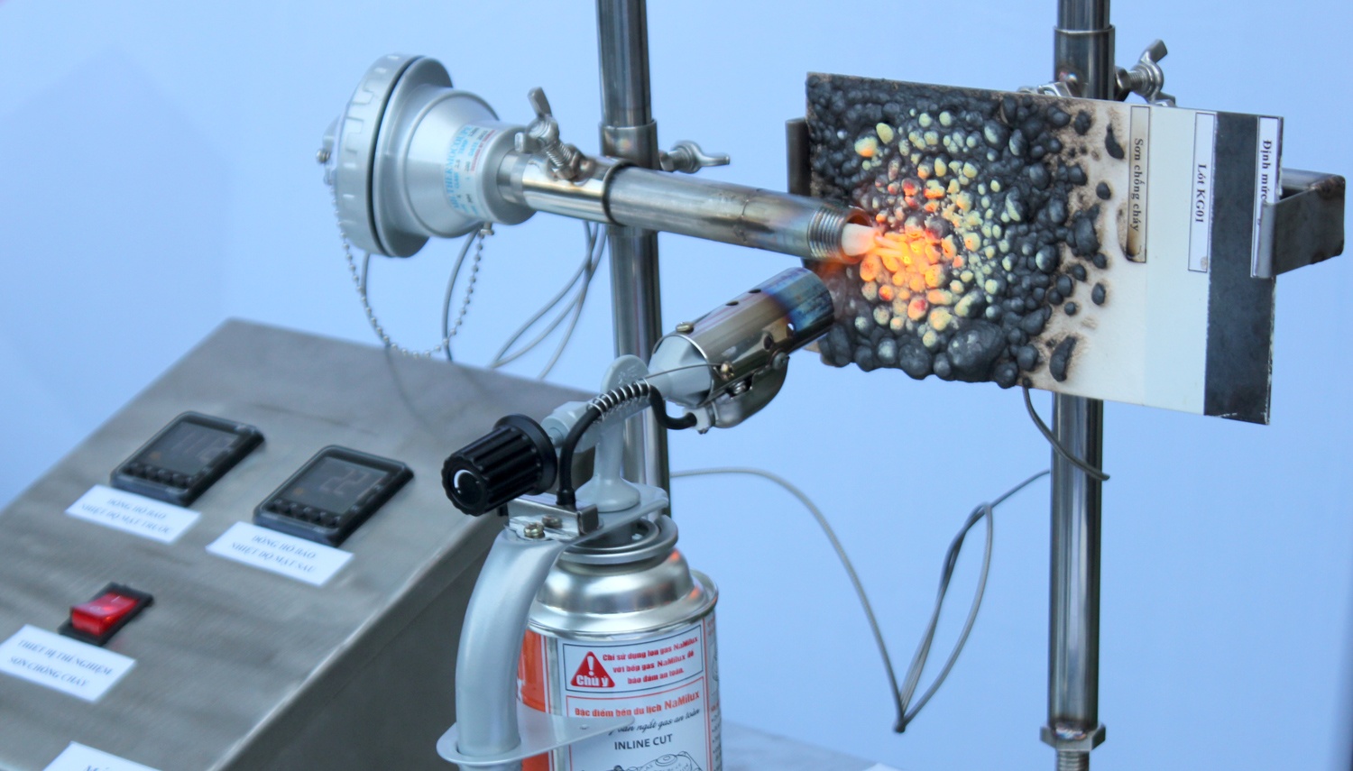 | Thực nghiệm đốt cháy hơn 1.000 độ C vật liệu phủ sơn chống cháy nano vỏ làm từ vỏ trấu. Khi tiếp xúc lửa, sơn sẽ phồng lên tạo nên một bề mặt chịu nhiệt, cách ly lửa với bề mặt vật liệu. Ảnh: Zen Nguyễn |