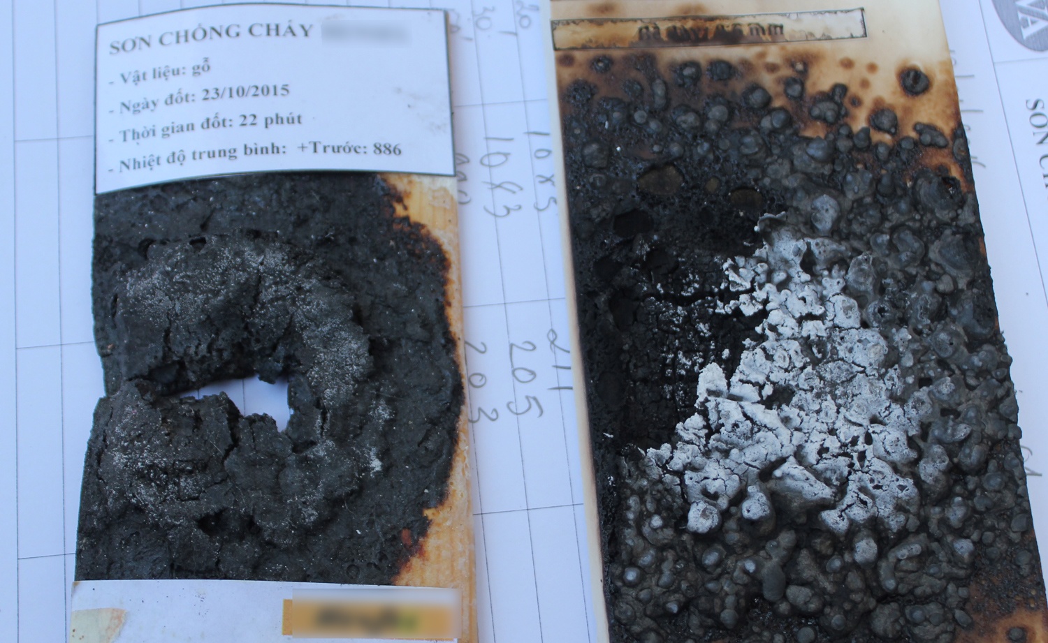 | Bên phải là gỗ phủ sơn chống cháy công nghệ nano vỏ trấu bị đốt hơn 1 giờ vẫn không thủng. Bên trái là gỗ phủ sơn chống cháy của Đức bị đốt sau 22 phút. Ảnh: Zen Nguyễn |