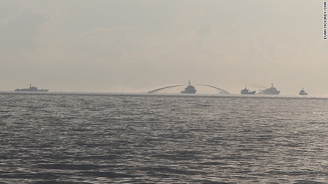 | Tàu Trung Quốc phun vòi rồng trên biển để tấn công các tàu Việt Nam. Ảnh: CNN |