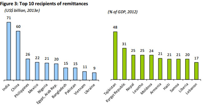| Top 10 nước nhận kiều hối lớn nhất năm 2013 (tỷ USD). |