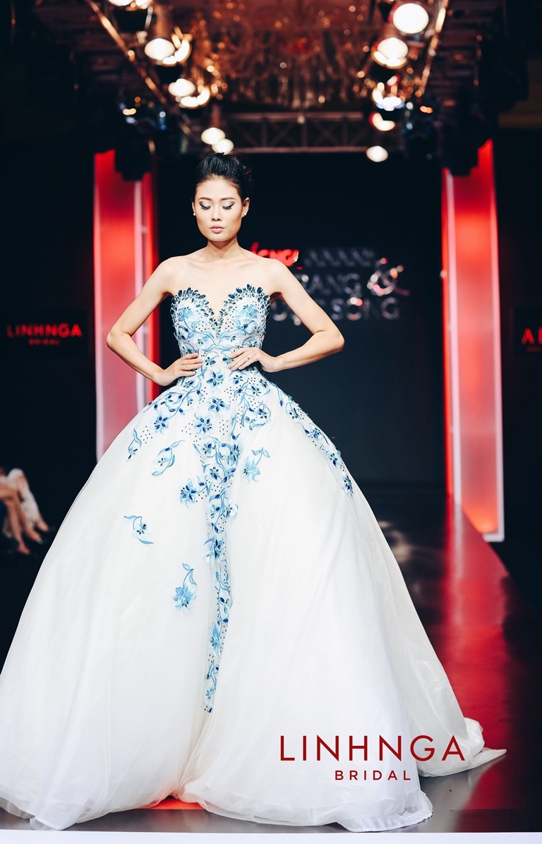 | Váy cưới xoè xếp nếp được đính 300 bông hoa ren màu xanh hoạ tiết hoàng gia, 1.000 viên pha lê xanh ngọc bích swarovski được Quán quân Vietnam Next Top Model 2012 Mai Giang trình diễn. |