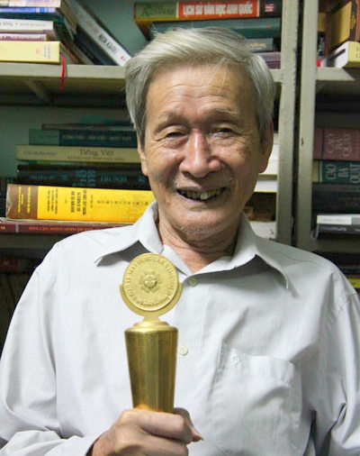 | Nhà văn Nguyễn Xuân Khánh vui với tượng Mai Vàng trên tay Ảnh: NGUYỄN ĐÌNH TOÁN |