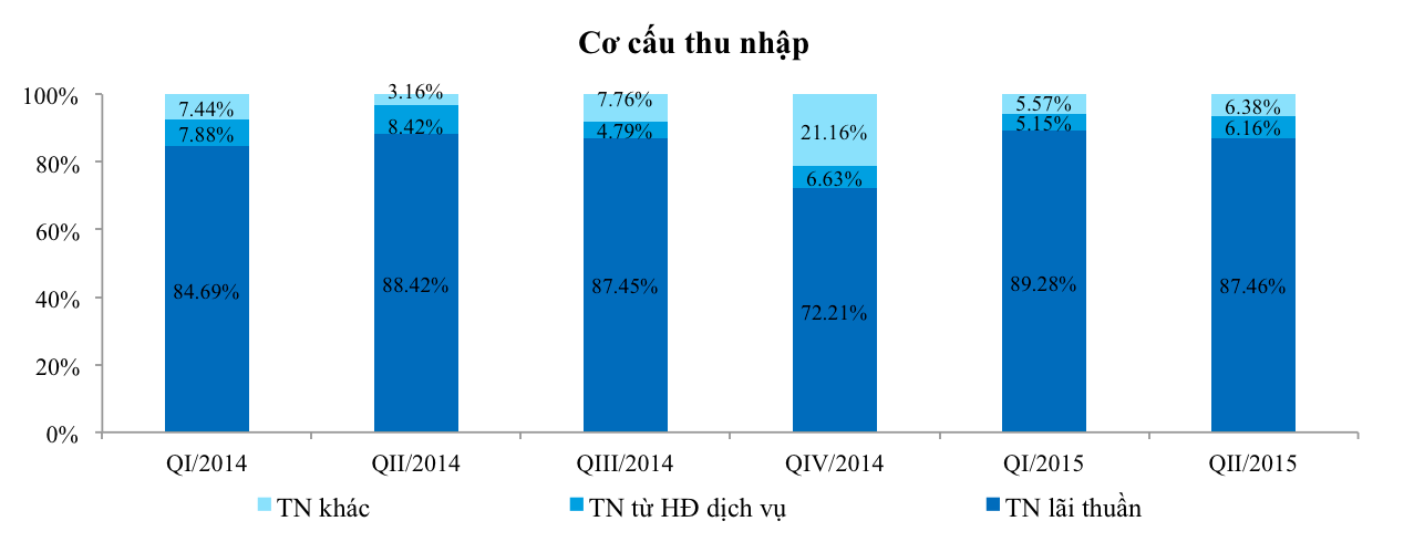 Lũy kế từ đầu năm đến hết 30/6, tổng thu nhập hoạt động của VietinBank tăng 11,68% so với cùng kỳ năm trước, đạt gần 11.000 tỷ đồng. Trong đó, thu nhập lãi thuần tăng 8,45% và thu nhập thuần từ hoạt động dịch vụ tăng 1,24%. Đây vẫn là hai nguồn thu chính của ngân hàng (chiếm 94% tổng thu nhập hoạt động). Trong các khoản thu nhập còn lại, thu nhập từ mua bán chứng khoán kinh doanh tăng mạnh 89,58% so với cùng kỳ năm trước (từ 60,4 tỷ đồng tại 6T2014 lên 114,4 tỷ đồng tại 6T2015) do ngân hàng đẩy mạnh hoạt động kinh doanh chứng khoán, cùng với điều kiện thị trường thuận lợi khiến thu nhập từ hoạt động này tăng mạnh.