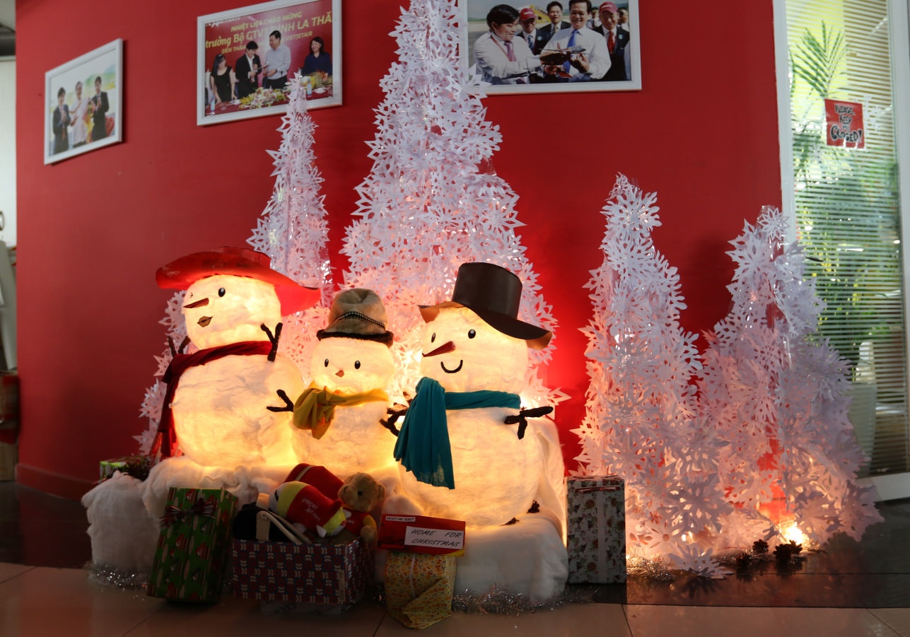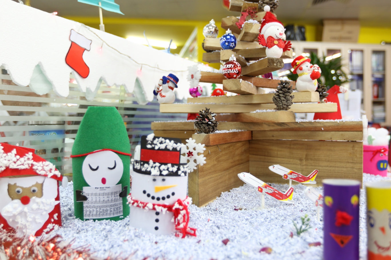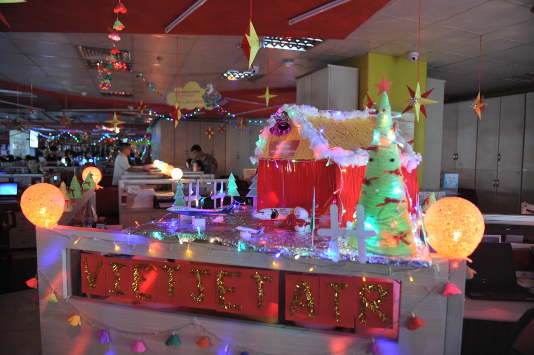 Những ngày cuối năm tại sảnh lễ tân của “tổng hành dinh” Vietjet luôn ngập tràn sắc màu Giáng sinh. Một cuộc thi trang trí góc làm việc đang được diễn ra giữa nội bộ các phòng ban của Vietjet. Là hãng hàng không “chuyên chở nụ cười”, các nhân viên Vietjet đã lan tỏa không gian đầy cảm hứng lễ hội đến đông đảo hành khách bằng những thông điệp thú vị theo cách của Vietjet. |