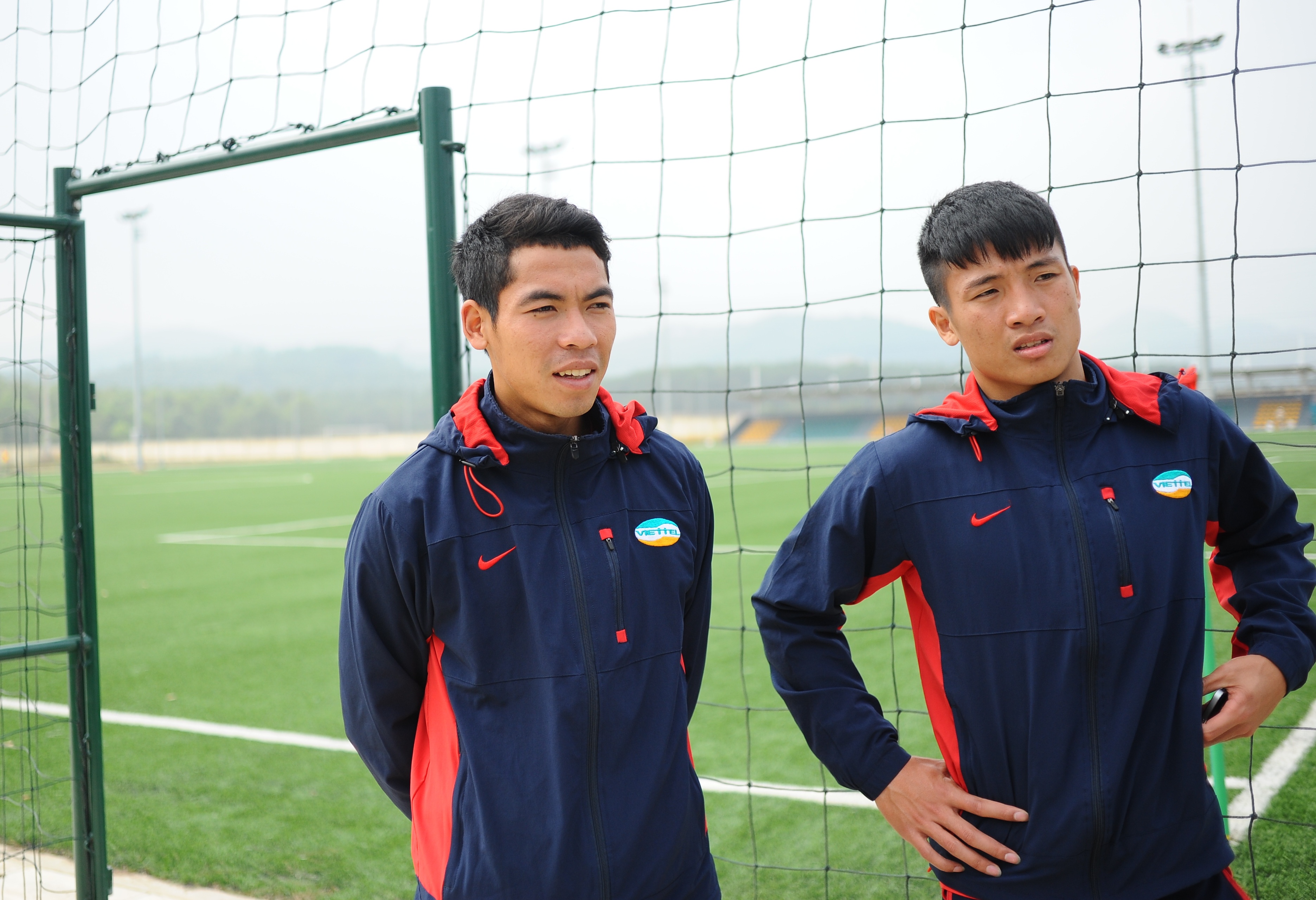 | Các cầu thủ trẻ Viettel trong buổi thăm trung tâm đào tạo mới. Trung vệ Trương Văn Thiết (trái) và Bùi Tiến Dũng (phải) là 2 nhân tố xuất sắc của lò đào tạo Viettel và từng khoác áo U19 Việt Nam trong năm 2014. |