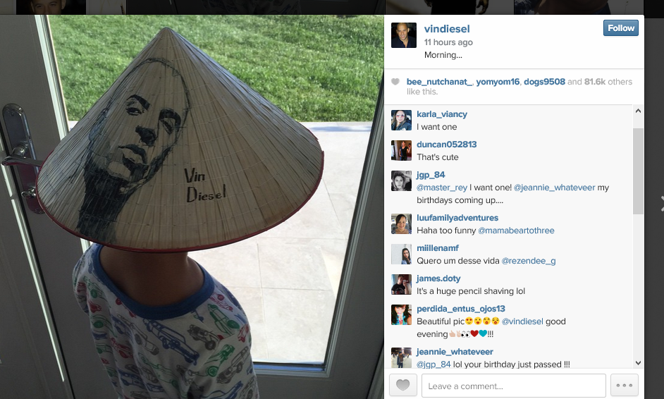 Trở về nước Mỹ, Vin Diesel lập tức khoe chiếc nón trên trang Instagram cá nhân trong ngày 30/3. Người đội chiếc nón trong bức hình mà ngôi sao chụp lại là con trai anh - bé Vincent Sinclair, 5 tuổi. Không ít người hâm mộ Việt Nam trên mạng xã hội đã để lại bình luận cho ngôi sao hành động bên dưới tấm hình anh chia sẻ. Họ bày tỏ tình cảm và mong nam diễn viên sẽ sớm tới Việt Nam.