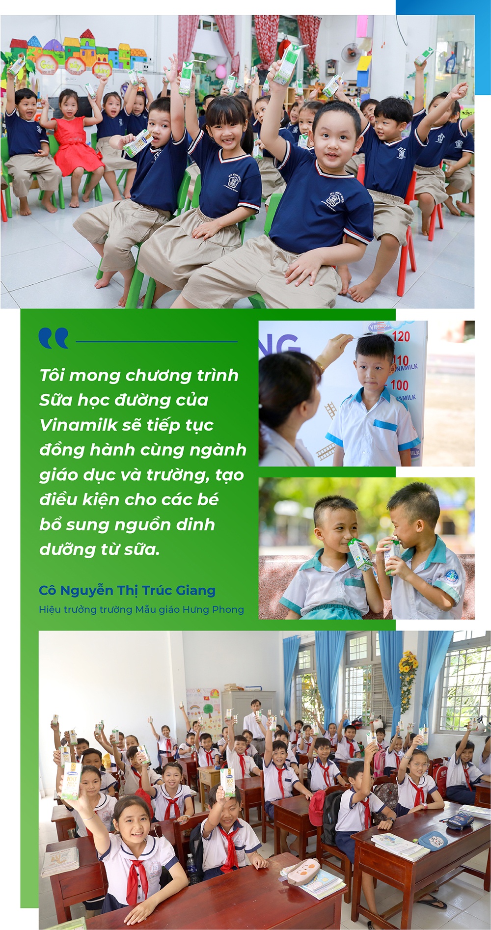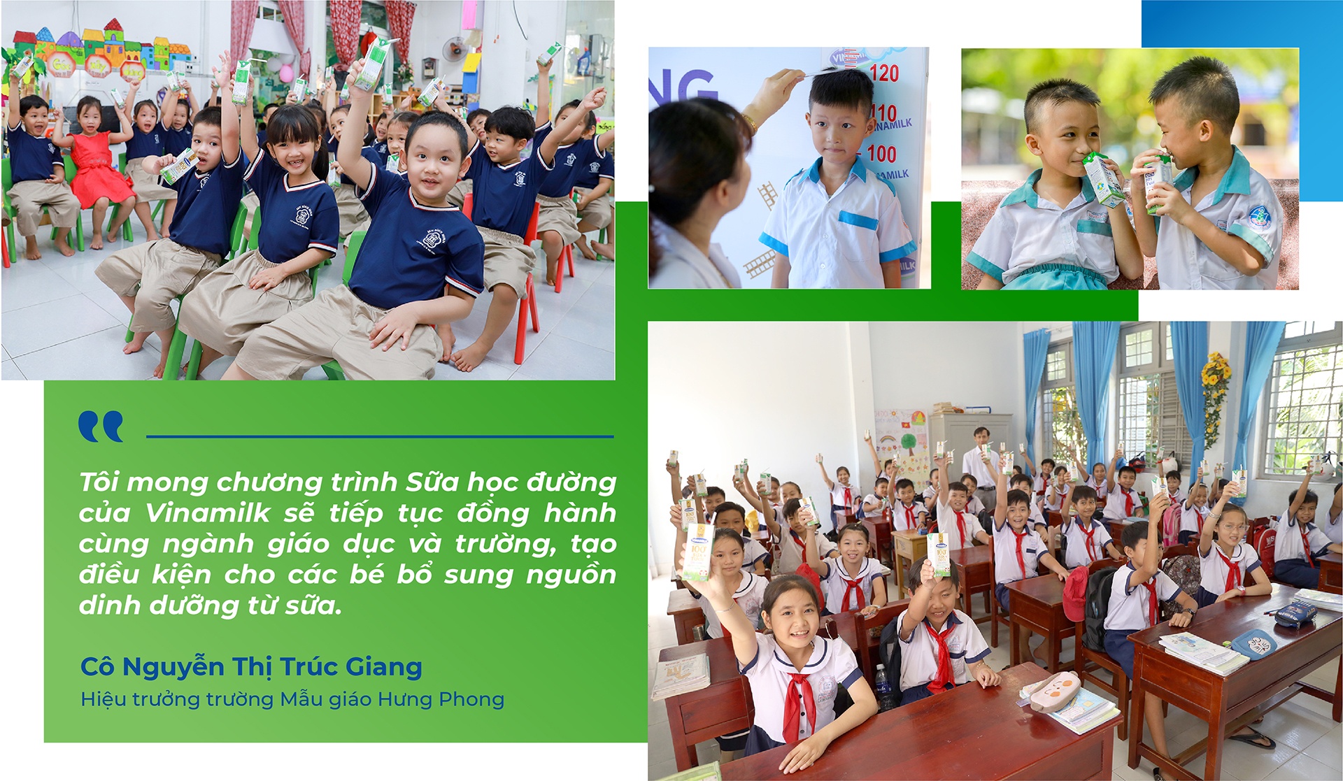 Theo cô Nguyễn Thị Trúc Giang, Hiệu trưởng trường Mẫu giáo Hưng Phong (xã Hưng Phong, huyện Giồng Trôm, Bến Tre), từ khi tham gia uống sữa học đường, học sinh của trường phát triển thể lực khá tốt. “Ở trường tôi, hầu như không còn trẻ suy dinh dưỡng và thấp còi. Tôi mong chương trình Sữa học đường của Vinamilk sẽ tiếp tục đồng hành cùng ngành giáo dục và trường, tạo điều kiện cho các bé bổ sung nguồn dinh dưỡng từ sữa”, cô Giang bày tỏ thêm.