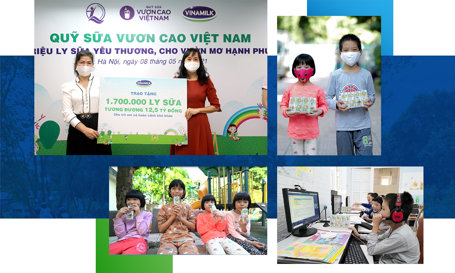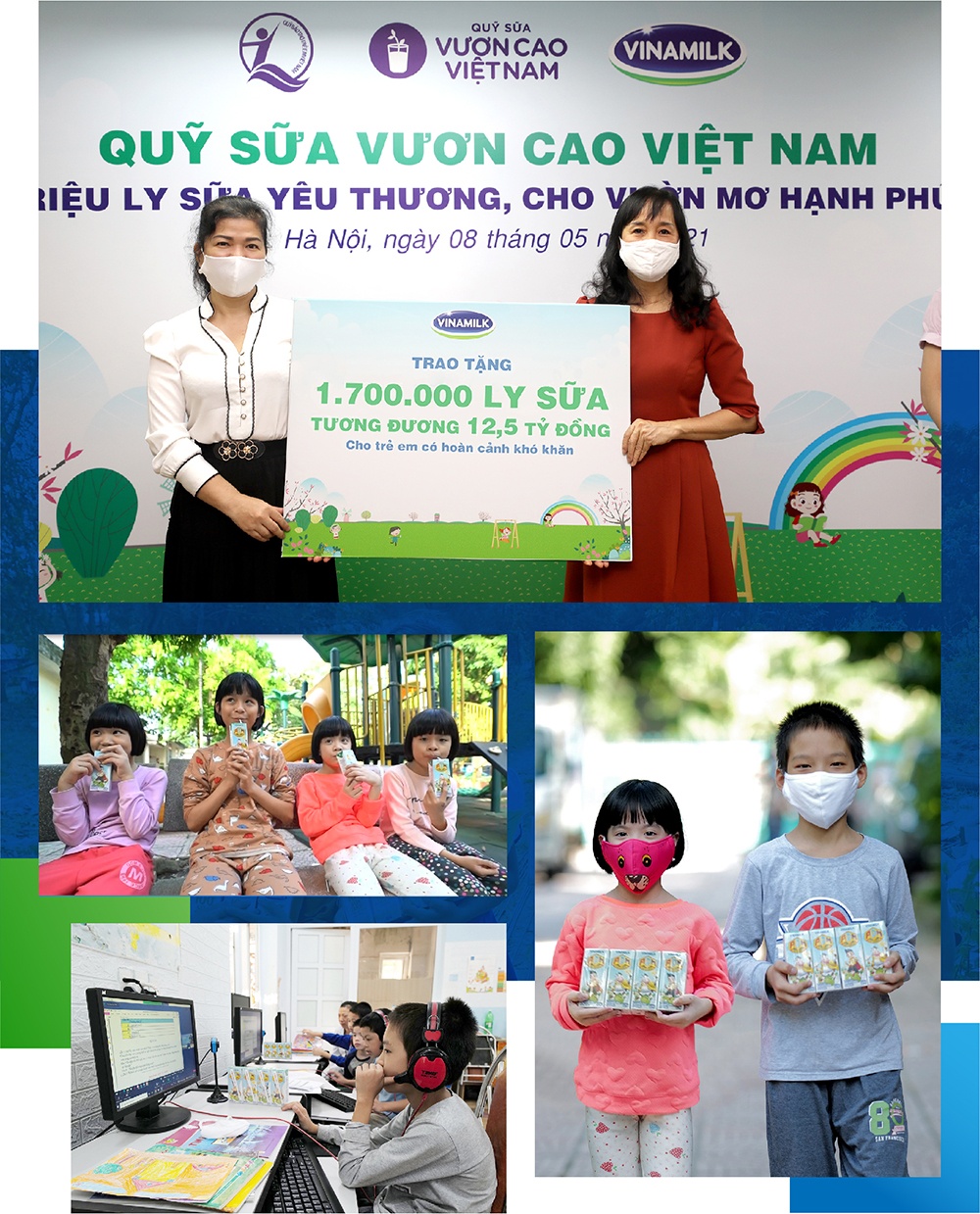 “Để mọi trẻ em Việt Nam đều được uống sữa mỗi ngày” là mục tiêu Vinamilk và Quỹ bảo trợ trẻ em Việt Nam đặt ra khi thành lập Quỹ sữa Vươn cao Việt Nam vào năm 2008. Đến nay, quỹ đã trao 38,7 triệu ly sữa, tương đương khoảng 175,5 tỷ đồng, giúp hơn 479.000 trẻ em khó khăn Việt Nam nhận được sự chăm sóc tốt hơn về dinh dưỡng, tạo tiền đề cho sự phát triển thể chất và trí tuệ, hướng đến tương lai khỏe mạnh, hạnh phúc.
