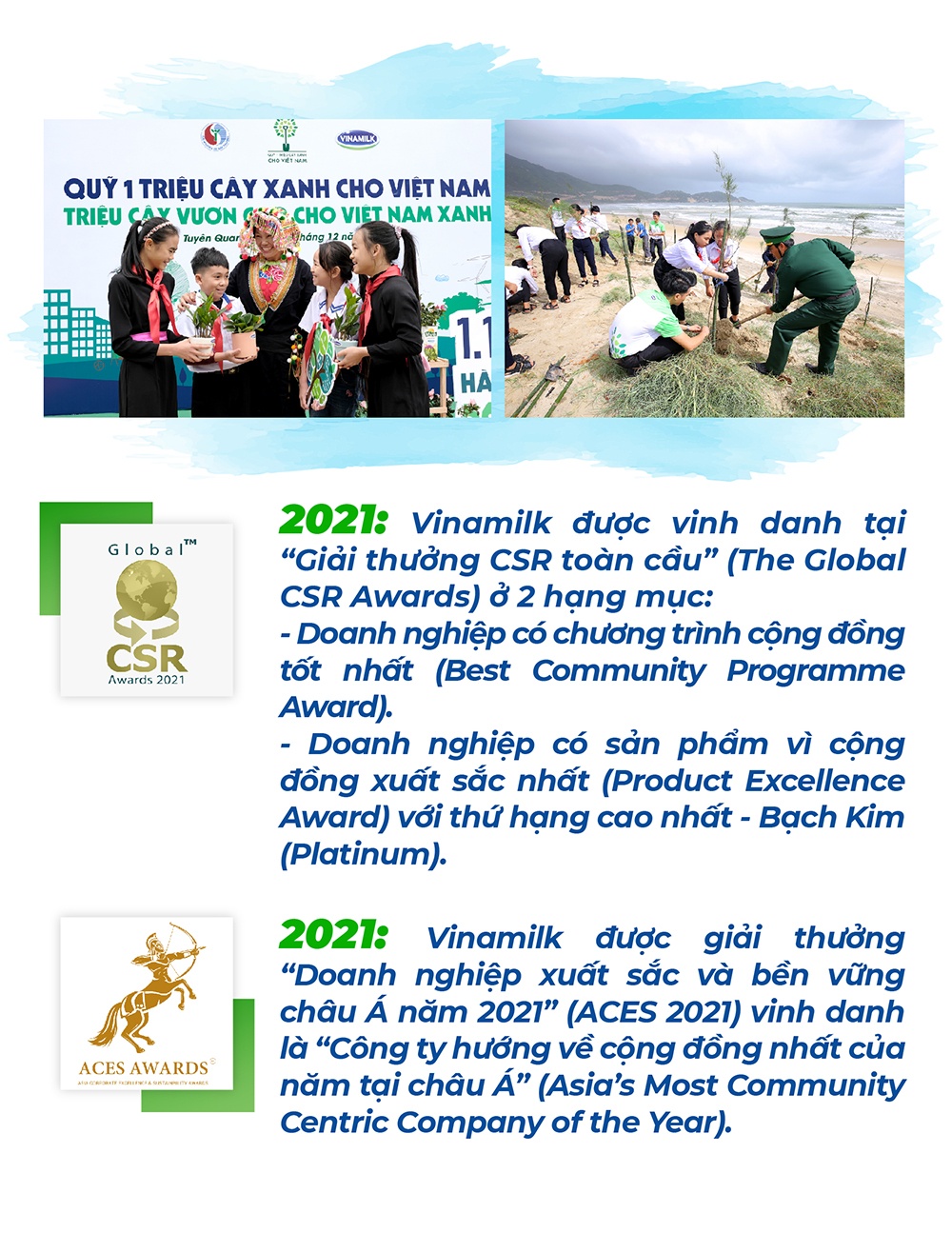 Bên cạnh tích cực chăm sóc dinh dưỡng, sức khỏe cho trẻ em, Vinamilk còn góp sức cùng thế hệ tương lai xây dựng môi trường sống trong lành và bền vững qua Quỹ 1 triệu cây xanh cho Việt Nam. Quỹ từng được Giải thưởng CSR toàn cầu 2020 (The Global CSR Awards 2020) vinh danh là “Top 10 hoạt động vì môi trường xuất sắc” cho nhiều đóng góp tích cực. Trải qua 9 năm, quỹ đã trồng hơn 1,121 triệu cây xanh tại 56 địa điểm thuộc 20 tỉnh, thành phố, tổng giá trị 12,5 tỷ đồng.