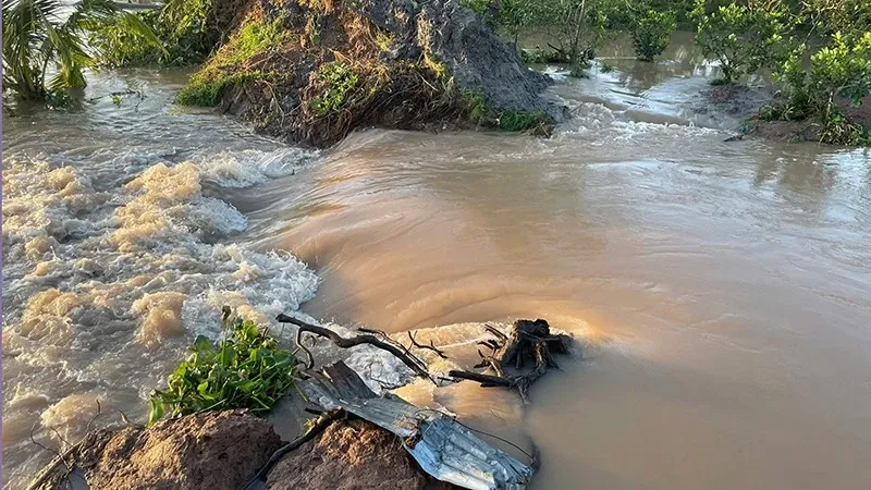 Đoạn đê bao cồn Thanh Long thuộc ấp Phước Lý Nhì, xã Quới Thiện, tỉnh Vĩnh Long bị sạt lở vào khoảng 1h sáng 5/12. Nước từ ngoài sông tràn vào khiến căn nhà dưới của một hộ dân bị cuốn trôi, nhiều vườn cây ăn trái bị ngập.