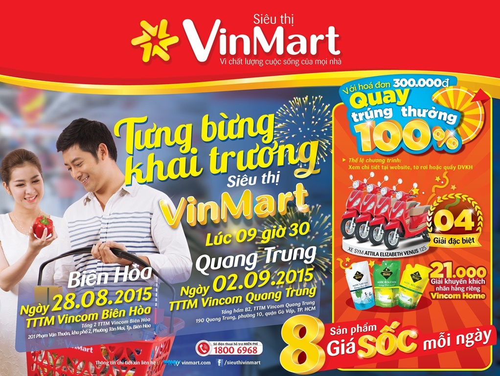 Hai siêu thị lớn mới khai trương là VinMart Biên Hòa và VinMart Quang Trung sẽ diễn ra vào các ngày 28/8 và 2/9.